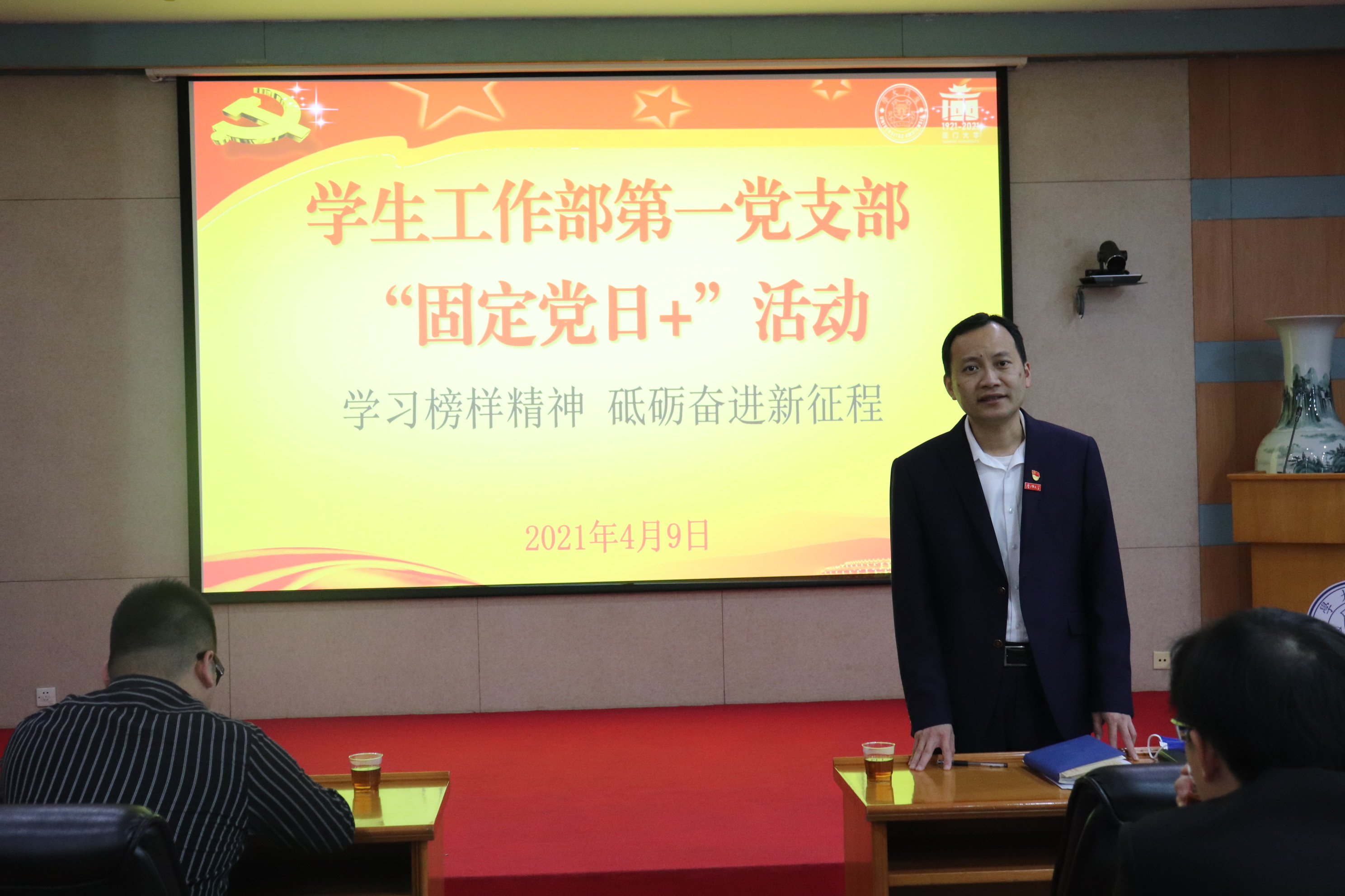 4月9日下午,学生工作部第一党支部在颂恩楼220报告厅开展“固定党日+”活动,以“学习榜样精神砥砺奋进新征程”为主题,组织支部党员认真学习习近平总书记致厦门大学建校100周年的贺信精神,并观看《榜样5》专题节目。