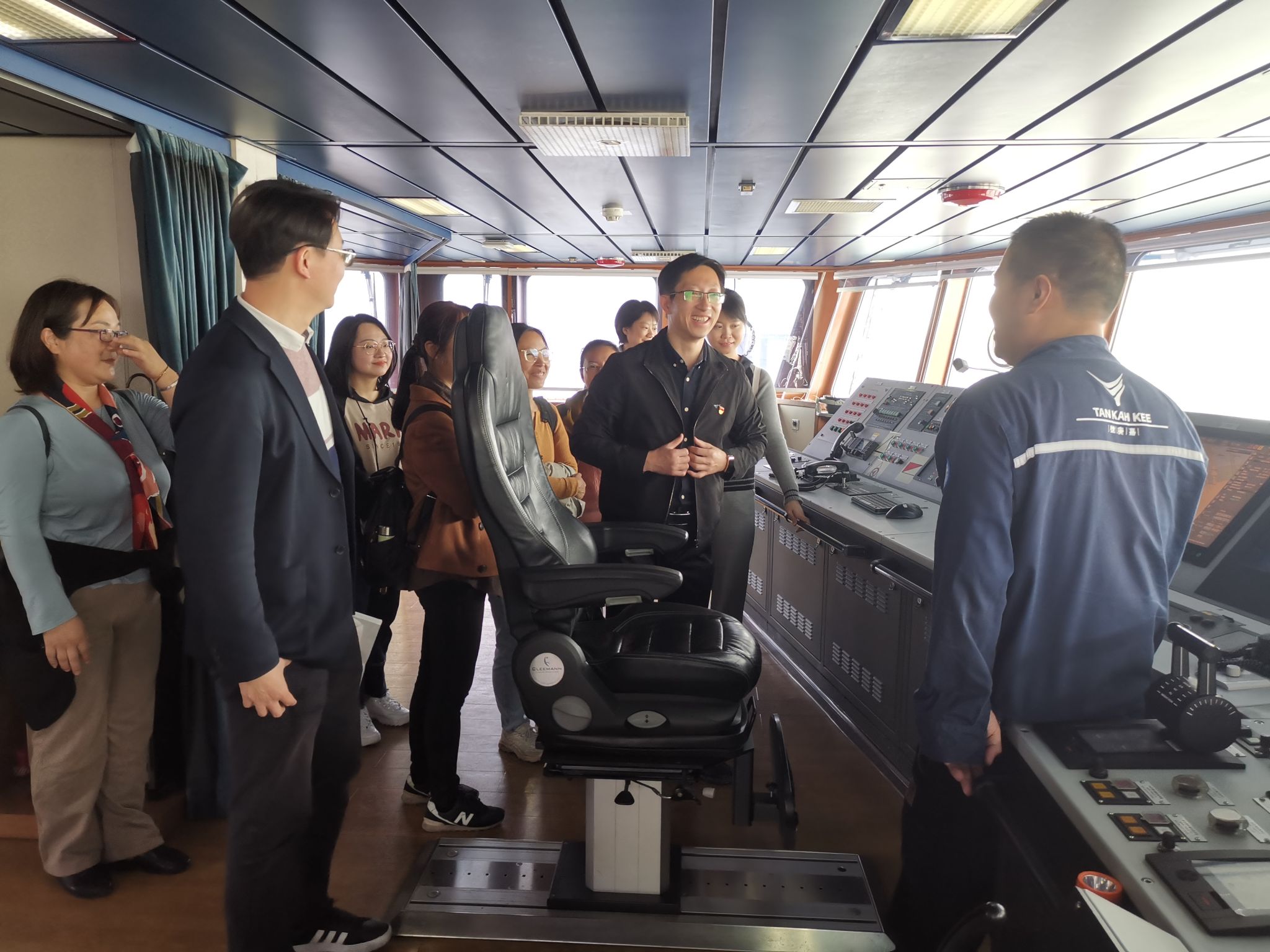 座谈会结束后,海洋与地球学院副院长李骁麟带领大家参观了“嘉庚”号科考船的驾驶舱、各类实验室以及生活区,生动地讲解了“嘉庚”号的创建过程、运作模式以及科技影响力等,让大家深入了解了这所“海上厦大”。“嘉庚”号海洋先锋党支部书记赵振明向大家介绍了“嘉庚”号的使命,除了日常科考任务,自2018年起,它还推出“海丝学堂”人才培养计划和“海洋大讲堂”科普课程,不但着力培养海洋学科的拔尖人才,更把海洋教育课堂延伸到中、小学,为实现海洋强国的梦想全方位培养储备人才。