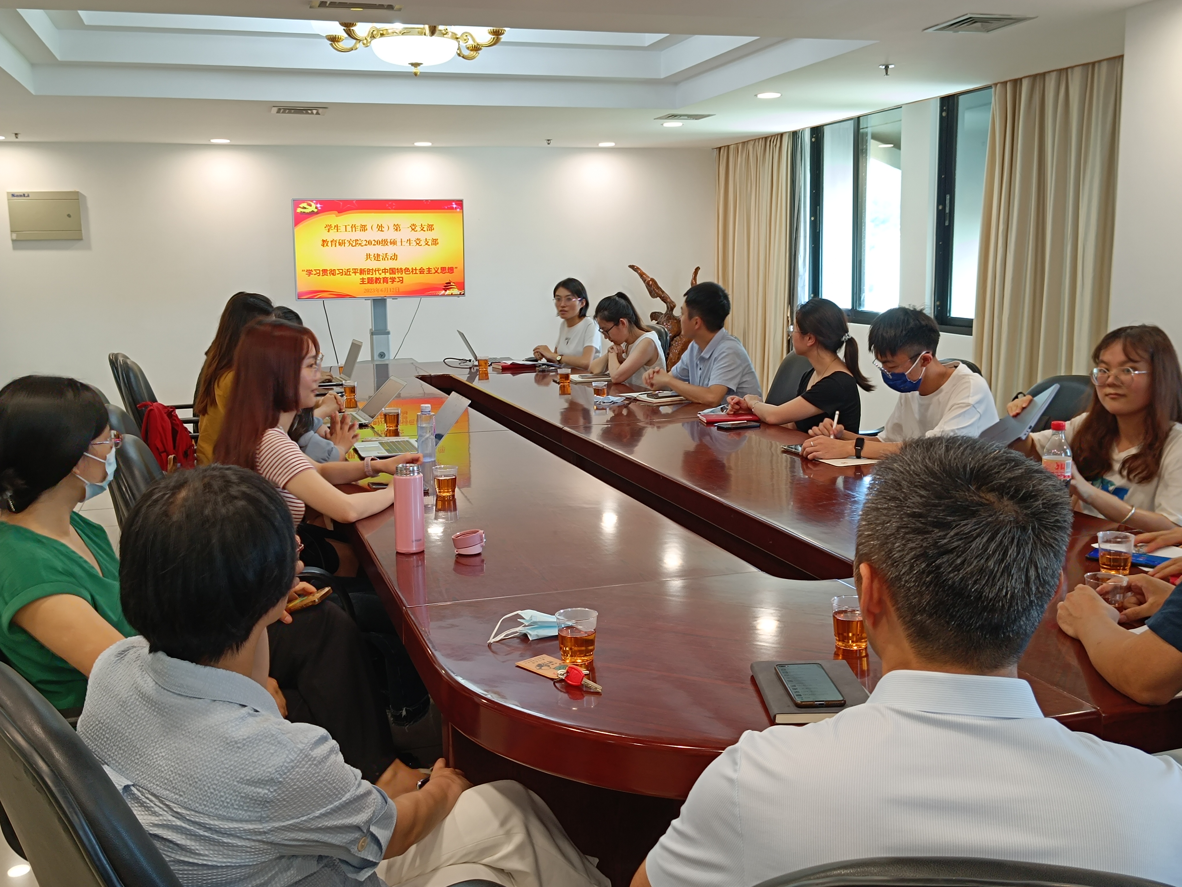 为扎实推进学习贯彻习近平新时代中国特色社会主义思想主题教育,进一步深化党支部结对共建工作,6月12日下午,学生工作部(处)第一党支部与教育研究院2020级硕士生党支部在颂恩楼1605室开展联学共建活动暨党支部主题教育第3次集中学习交流,以浙江省“千万工程”经典案例为主题开展政治理论学习。