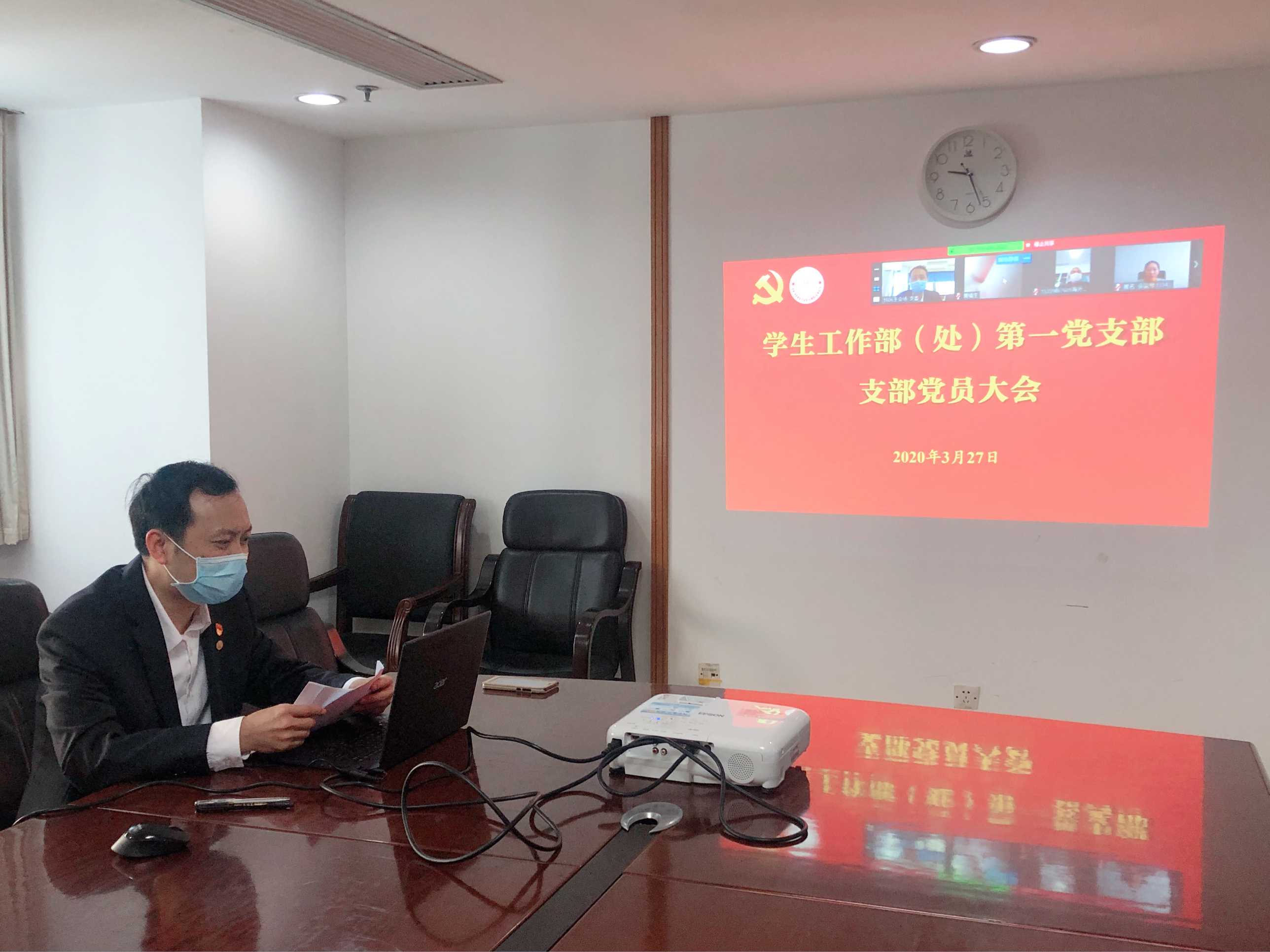 3月27日上午,支部运用“随会”系统召开支部党员大会,主会场设于1606会议室,支部在职党员全数参会,支部副书记杨明伟主持会议。会议旨在加强理论学习,用党建工作推动以疫情防控为重点的各项学生工作扎实、有序、高效开展。