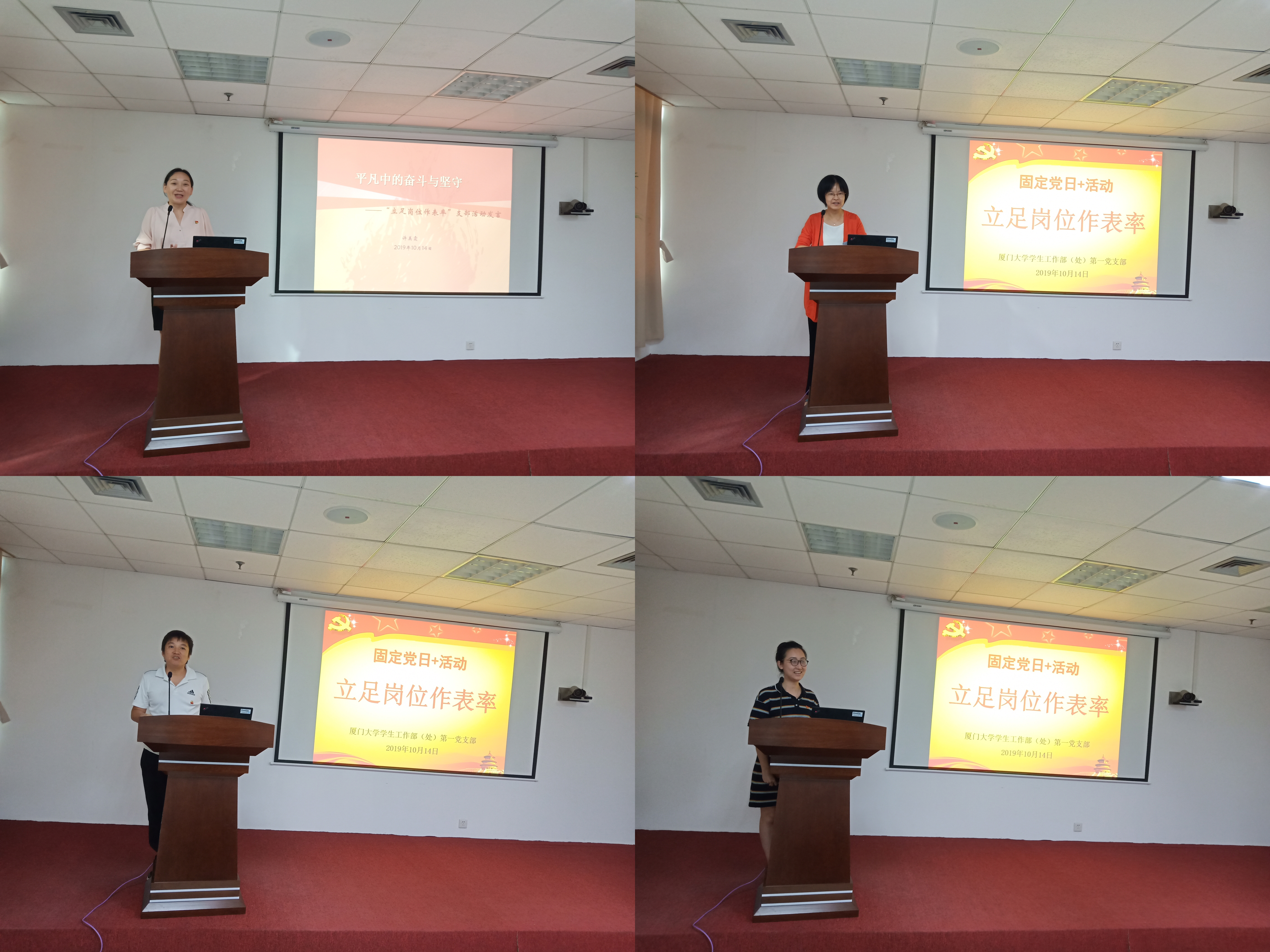 四名支部党员代表发言畅谈自己对“立足岗位做表率”的理解与实践。许美霞同志做了《平凡中的奋斗与坚守》主题发言,她用刘传健机长临危不惧、奇迹般化险为夷和张富清同志浴血奋战、默默奉献丰功伟绩的事迹,诠释自己对“平凡出自伟大,平凡造就伟大”的理解,通过讲述自己多年在学生工作战线与学生接触的感悟,表达自己因热爱而坚守的决心。赖丹凤从自己身负的五种工作岗位和三种生活角色的角度,分别指出不同岗位、角色的不同要求。杨明伟从几件工作小事讲起,表示要立足本职岗位,做先锋模范,精益求精,勇于担当,提升能力,爱岗敬业。陈子岚作为工作时间不长的新人,表示自己要坚定立场,与时俱进,加强学习,注重细节,甘于奉献。