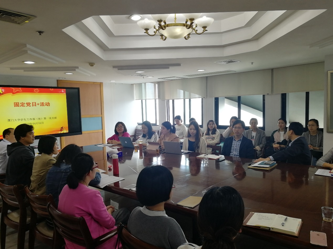 219年4月15日下午,学生处第一党支部在颂恩楼1609会议室开展固定党日+活动,开展政治理论学习,共建学生党支部教育研究院2018级硕士生党支部参加了会议。会议由支部书记李峰老师主持。