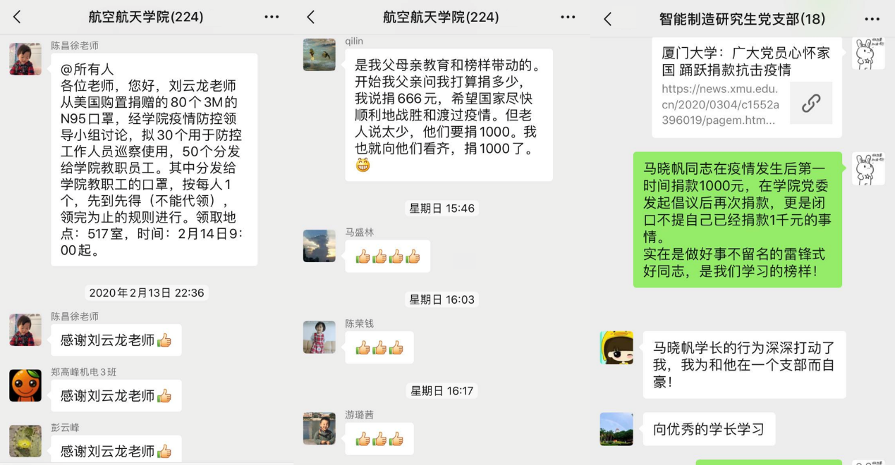 在日常防疫工作之外,学院党委还在广大党员师生中积极倡议动员,掀起捐款捐物热潮,学院全体在职教工党员率先完成捐款。正在美国加州大学洛杉矶分校访学的自动化教工党支部副书记刘云龙第一时间辗转美国各地购买N95口罩80个,由爱人带回国内,捐献给学院,受到师生一致点赞。智能制造研究生党支部党员、2019级博士生马晓帆在疫情发生后第一时间捐款1000元,并在学院发起倡议后再次捐款。退休党员教师林麒和她的父母,三名老党员一道捐款3000元。她的父母也是老厦大人,解放初就加入中国共产党。当看到以习近平同志为核心的党中央带头为新冠肺炎疫情防控工作捐款,毫不犹豫响应学校募捐倡议积极捐款,他们说,“听党话、跟党走,是我们这一代共产党员的信仰和追求。”