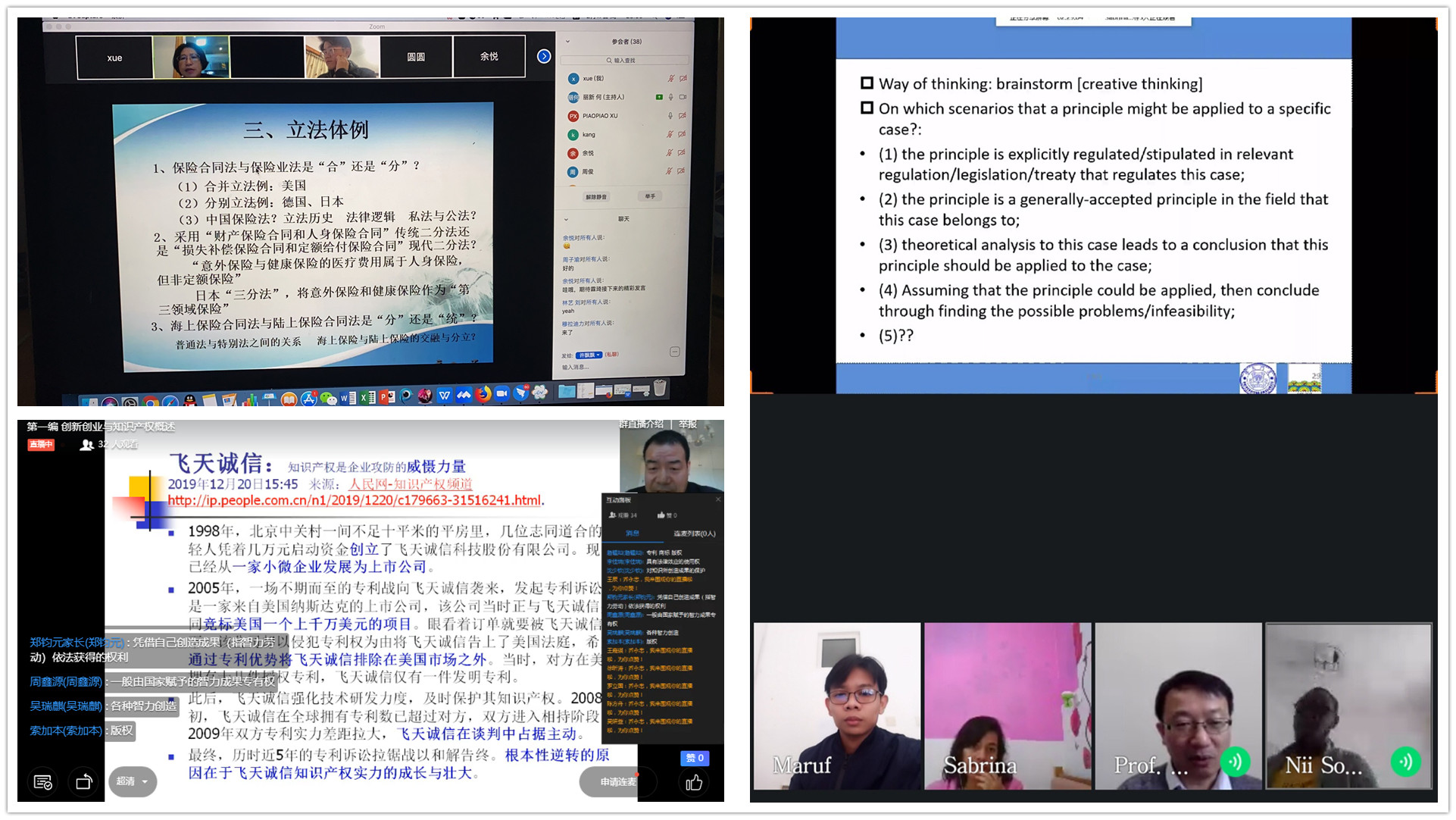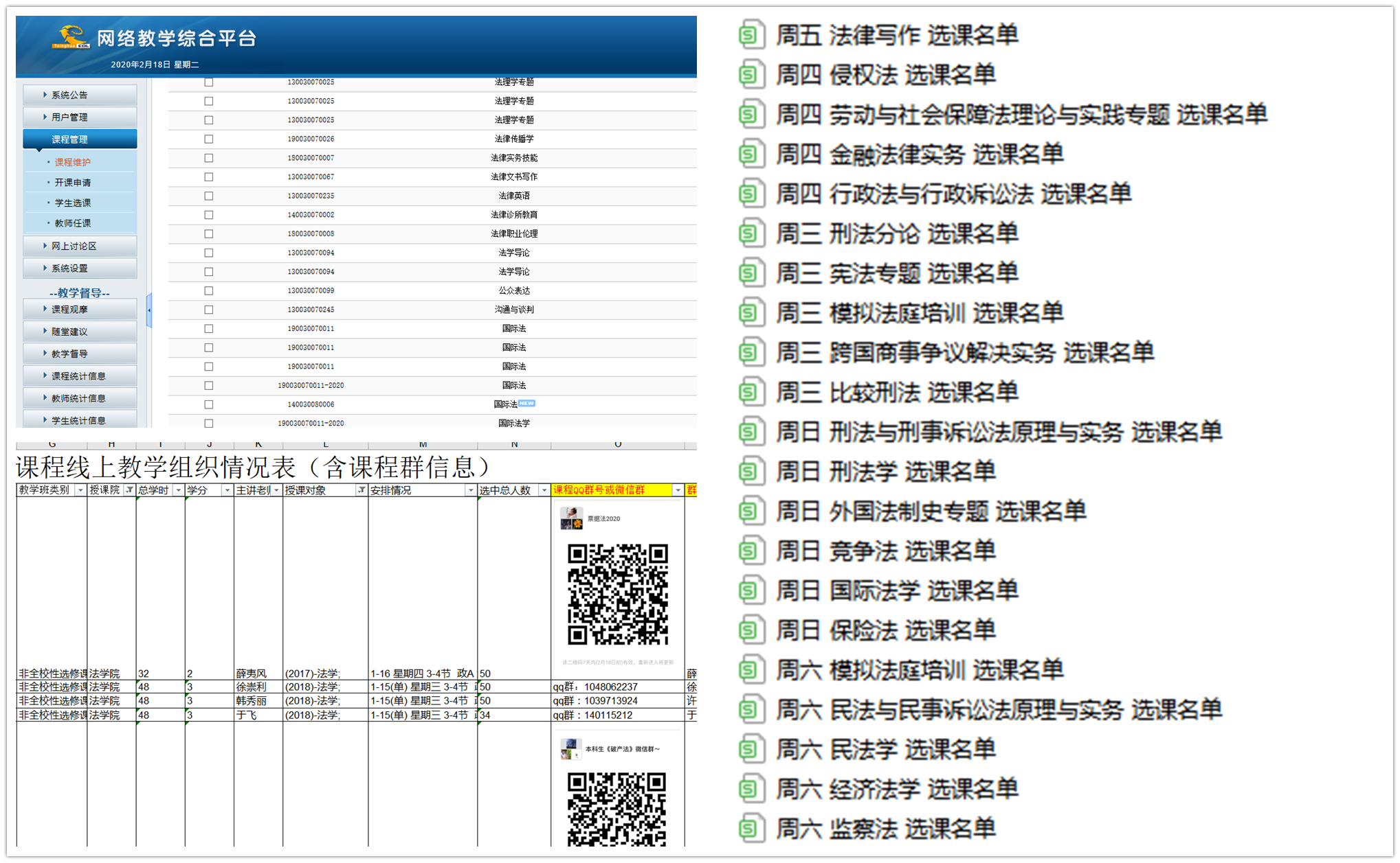 2019-2020年春季学期,法学院(含主修、辅修)共开课69门次,除1门取消、2门延期开课、3门毕业论文及实践性课程, 8门辅修未招生外,其余57门课均实现网络教学。研究生(含法学硕士、法律硕士、法学博士)共开课73门次,除6门取消、21门延期开课外,实际上网47门课程。知识产权研究院(含本科、研究生)共开课13门,取消3门,延期4门,实际上网6门课程。南海研究院新学期共开课 6门次,均实现网络教学。
