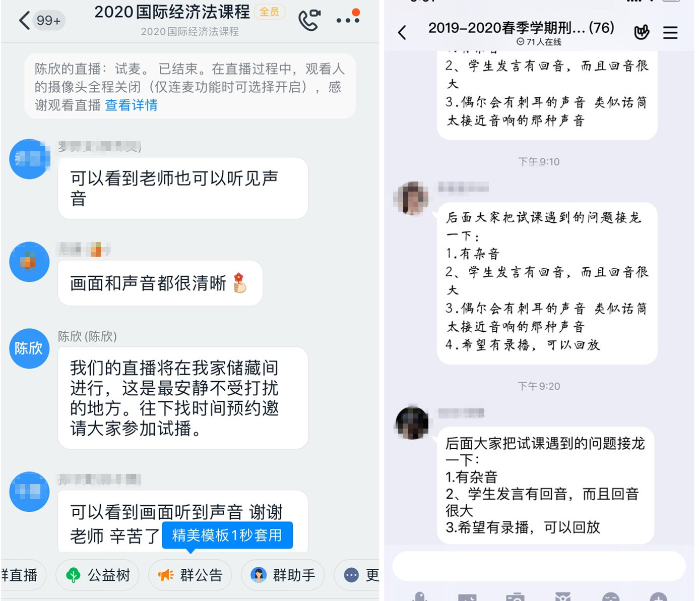 除未开课的课程外,所有课程均建立了课程群。学院教学秘书和辅导员协助任课教师通知选课学生入群。在17日开学之前,所有选课学生均已进入课程群。上课之前,辅导员再三强调上课秩序。学院上下通力合作,确保线上教学的开展。