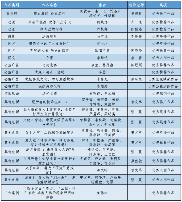自2023年9月第七届全国“一节一推选”活动启动以来,党委学生工作部主动谋划,依托校级易班·i厦大发展中心,利用网络技术创新报名渠道,做到作品信息一次性填写收集,实现参赛作品的可视化管理和全程化跟踪,活动也得到了党委宣传部、校团委和各院系的积极响应。最终,全校共征集到微电影、动漫、摄影、网文、公益广告、音频、短视频、校园歌曲、其他类网络创新作品等共计1010件作品,经部门评审和校外专家评审,择优推荐了177件作品到全国参赛,最终22件作品脱颖而出。其中,优秀推广作品2项、优秀展播作品5项、优秀推荐作品9项、优秀入围作品3项、优秀原创作品1项、优秀公益示范作品1项、优秀呈现效果作品1项。