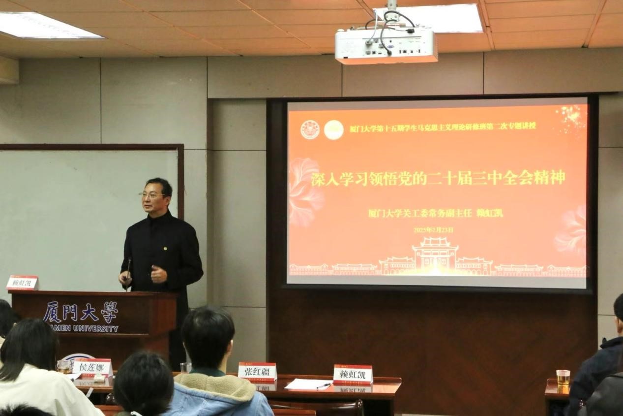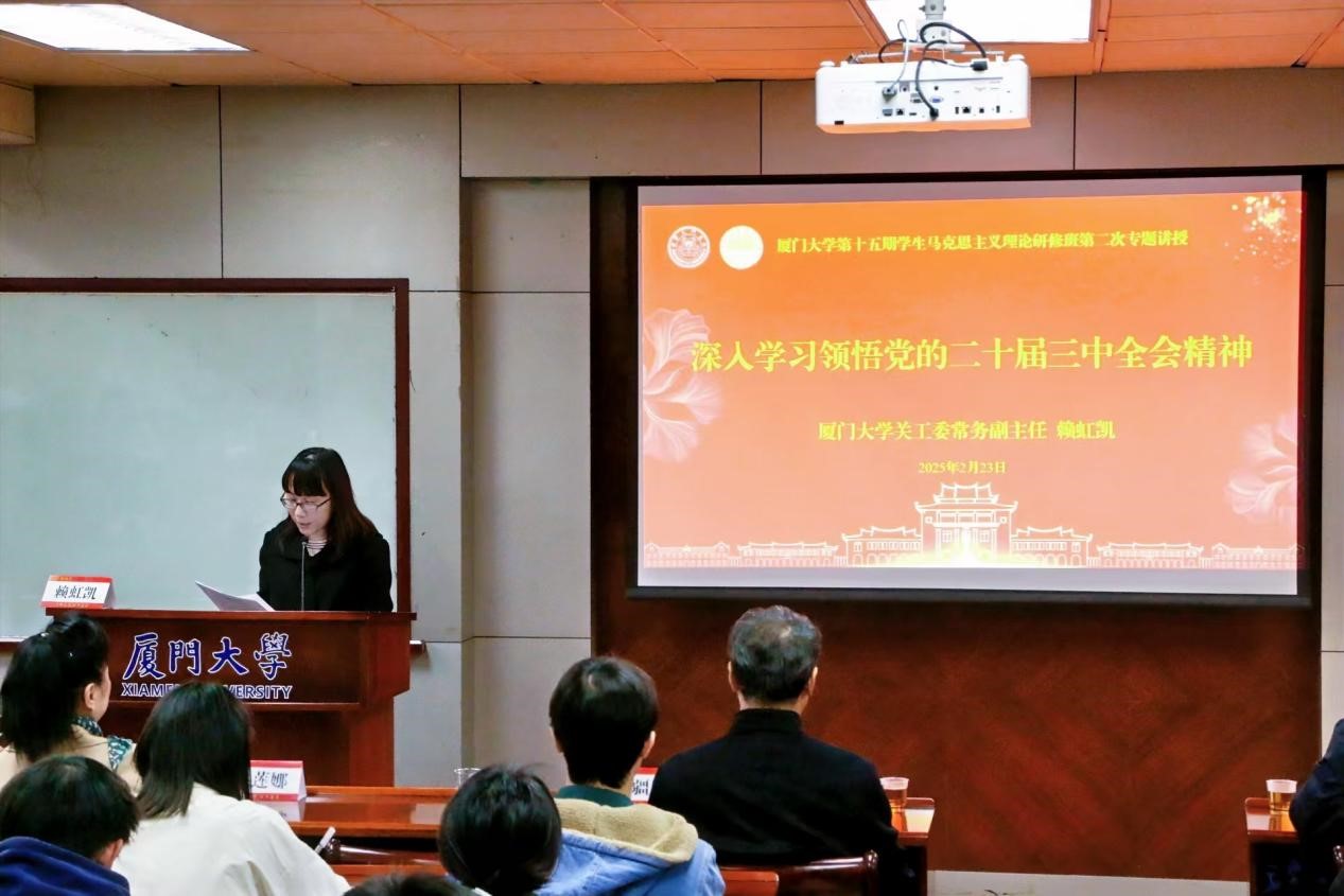 2月23日上午,厦门大学第十五期学生马克思主义理论研修班在思明校区嘉庚二201报告厅开展第二次集中理论学习。校关工委常务副主任赖虹凯老师为全体学员作《深入学习领悟党的二十届三中全会精神》专题报告。校关工委顾问黄如彬老师,关工委副主任白锡能老师、梁卫中老师、侯莲娜老师,关工委秘书张红疆老师以及第十五期马研班指导老师出席本次专题报告。活动由第十五期马研班班主任刘莉颖老师主持。
