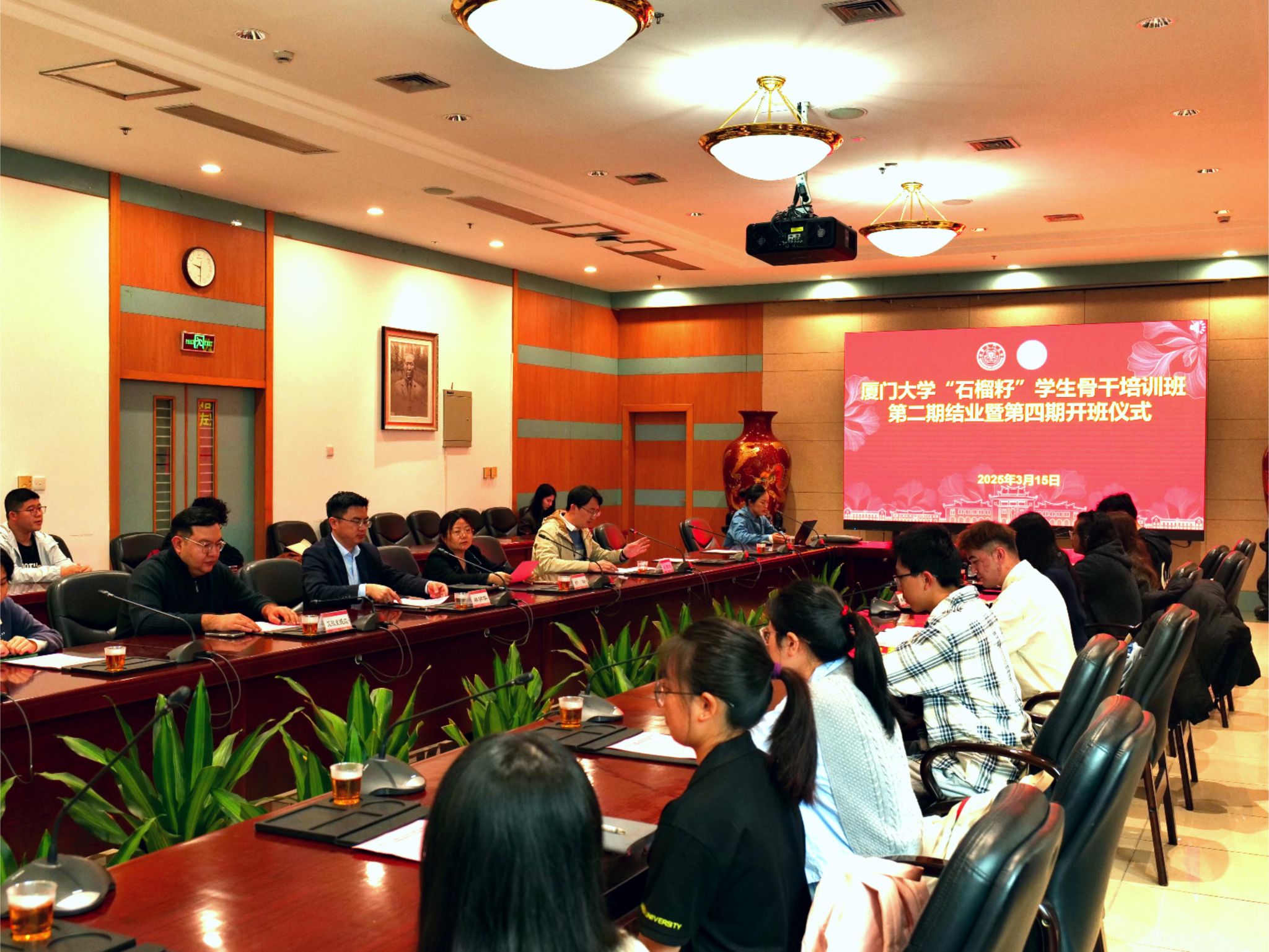 林明华在会上作讲话。他对石榴籽班在理论研习、实践研修、志愿服务等方面取得的一系列成绩表示充分肯定,并对第四期石榴籽班学员提出殷切希望:一是要在真学真信中坚定理想信念,牢记厦大青年学子的初心使命,不断增强对祖国的认同,对中华民族的认同,对中华文化的认同,对社会主义道路的认同,把人生理想融入国家和民族的事业之中。二是要在常学常新中加强理论修养,不断铸牢中华民族共同体意识,要进一步深入学习贯彻习近平总书记关于加强和改进民族工作的重要思想以及中央、省委民族工作会议精神,加强党史、新中国史、改革开放史、社会主义发展史、中华民族发展史的学习,共筑中华民族共有精神家园。三是要在知行合一中主动担当作为,争当捍卫民族团结的忠诚卫士,将爱党爱国爱民、爱校兴校荣校、民族团结进步的热情转化为实际行动,促进各民族师生的交往交流交融,为实现中华民族伟大复兴而团结奋斗。