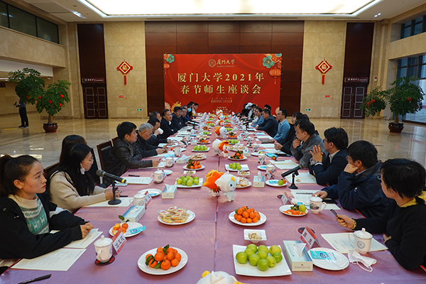 教师代表霍帅东、张原野、陈先礼,学生代表阿依加玛丽·艾尔肯、高洪伟、王邵娟首先在会上发言,参加座谈会的师生代表积极参与交流,回顾过去一年学习、科研经历,分享感悟、展望未来。大家纷纷表示,作为厦大“大家庭”的一员,共同分享着学校的荣光,也共同担负着学校的使命。农历鼠年,全体厦大人众志成城、共克时艰,在抗疫中度过了难忘的一年。新的一年,要积极发挥优势,拼搏进取、奋发有为、共迎百年校庆,努力在新征程中为学校“双一流”建设增光添彩。大家还就百年校庆筹备和“十四五”时期学校建设发展提出意见和建议。