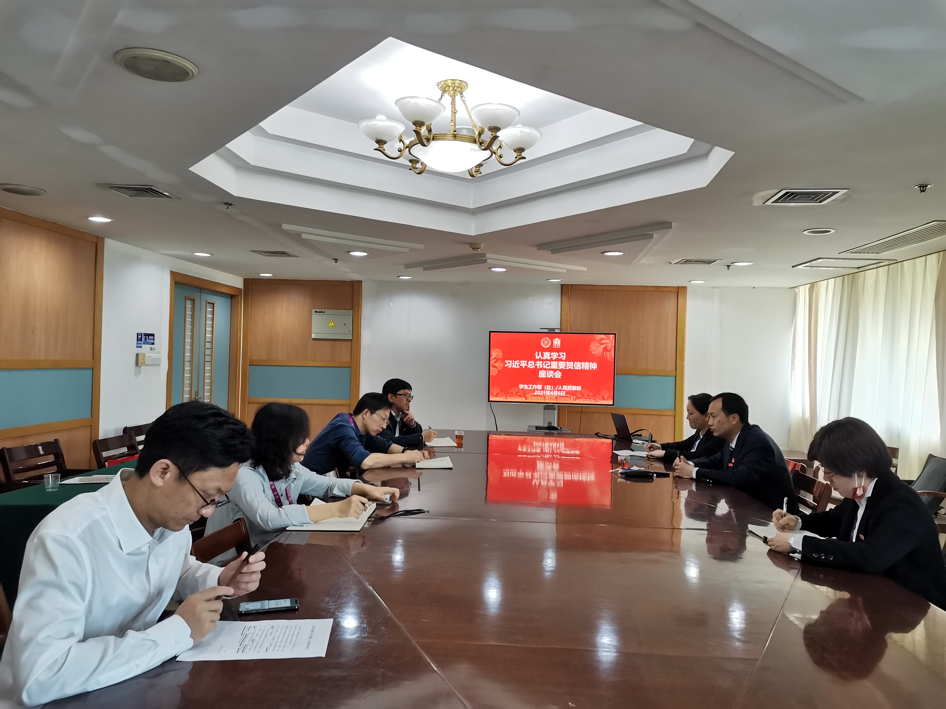 4月6日中午,学生工作部(处)/人民武装部召开部(处)务扩大会议,认真学习习近平总书记致厦门大学建校100周年贺信精神。李峰部长主持会议。