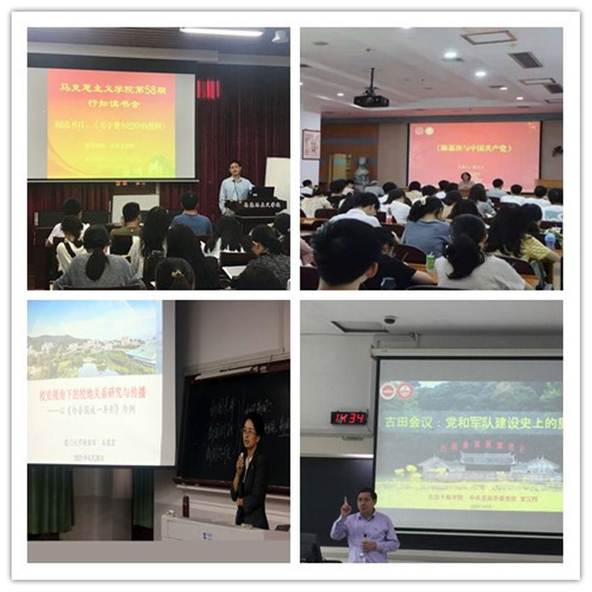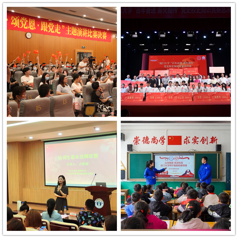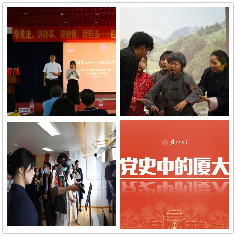 创:从创新中延伸教育的力度。创新学习模式。举办“讲好红色故事,迎接建党百年”红色影视作品配音大赛,重温红色经典,感悟百年风华;组织开展“回望四史忆百年,饮水思源迈向前”为主题的VR观影沉浸式党史体验展览活动,学生身临其境,体悟百年党史。创建教育平台。在学校主要媒体上开辟“学党史正当时”党史学习教育专栏,推送《党史中的厦大》《党史上的今天》等系列稿件,发布“身边的‘四史’微课堂”系列微视频,总结报道各学院开展学习教育的阶段性成果,唱响党史学习教育主旋律。创作文化作品。组织拍摄《囊萤之光——百年前的“00后”何以成为今日大学生的榜样》,累计浏览量超50万。师生共同精读党史,发挥创意思考和创作能力,形成28幅中国共产党人的精神谱系系列画作,传承百年党史。