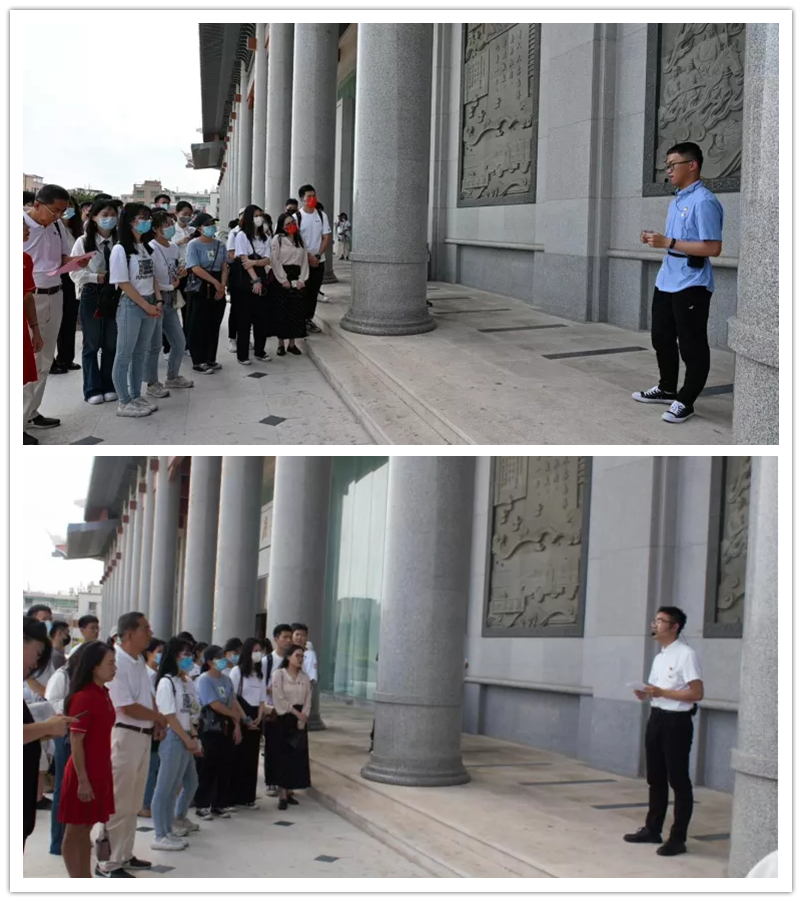 参观结束后,厦门大学首批囊萤星火青年讲师团成员、本科生第三党支部书记黄竞雄和土木工程系研究生第一党支部书记孙昊分别在纪念馆外陈嘉庚生平浮雕墙旁讲述主题微党课。