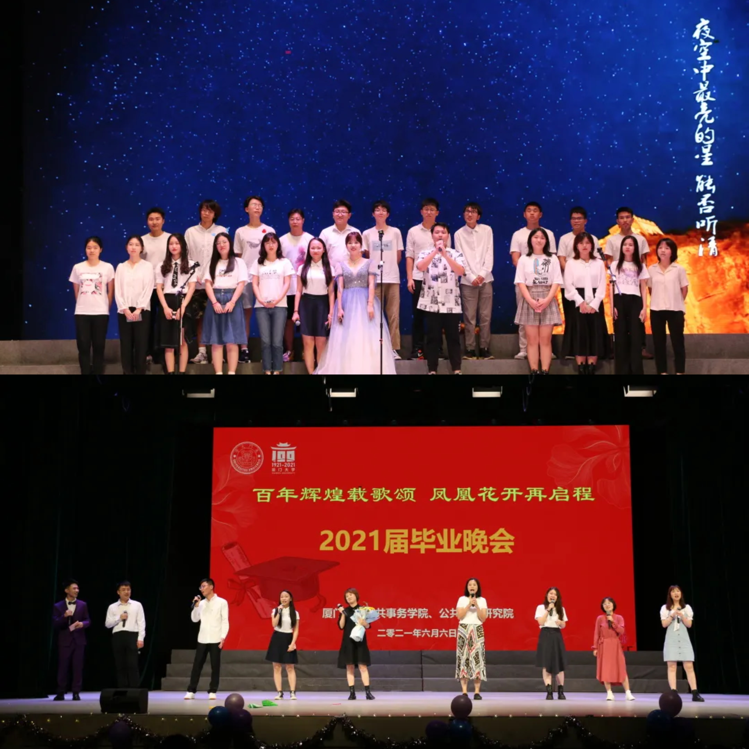 6月6日晚,以“百年辉煌载歌颂,凤凰花开再启程”为主题,公共事务学院/公共政策研究院2021届毕业晚会于建南大会堂举行。晚会分为“忆韶华,无悔厦园青春”“庆百年,情系南方之强”“再启程,归来仍是少年”三个篇章,涵盖了歌曲、舞蹈、舞台剧、相声、乐器演奏等多种形式,传递了学院对毕业生的祝福和毕业生对母校的感恩与不舍之情。