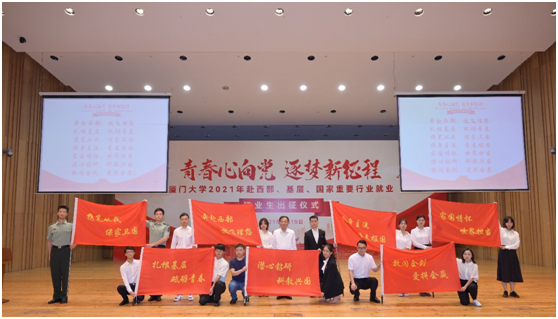 6月19日上午,我校2021年赴西部、基层、国家重要行业就业毕业生出征仪式在科学艺术中心举行,活动以“青春心向党•逐梦新征程”为主题,通过生动的形式、充实的内容、精心的组织打造一场别样的党史学习教育大课。校党委书记张彦、校党委副书记徐进功、中国人民解放军驻厦门大学后备军官选拔培训工作办公室主任王飞大校出席仪式。校学生工作部部长李峰主持仪式。