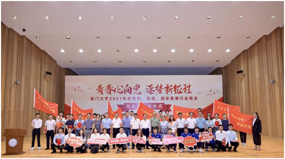 有关职能部门负责人,各学院党委副书记,毕业班辅导员,2021届到西部、基层、国家重要行业就业的毕业生代表和低年级学生代表等通过线上线下相结合方式参加了仪式。活动现场,学生工作部还为与会师生赠送了《为吾国放一异彩——厦门大学与伟大祖国》一书,希望师生通过学校服务国家战略和区域发展的生动故事,坚定扎根中华大地、书写家国情怀、绽放青春梦想的理想信念。