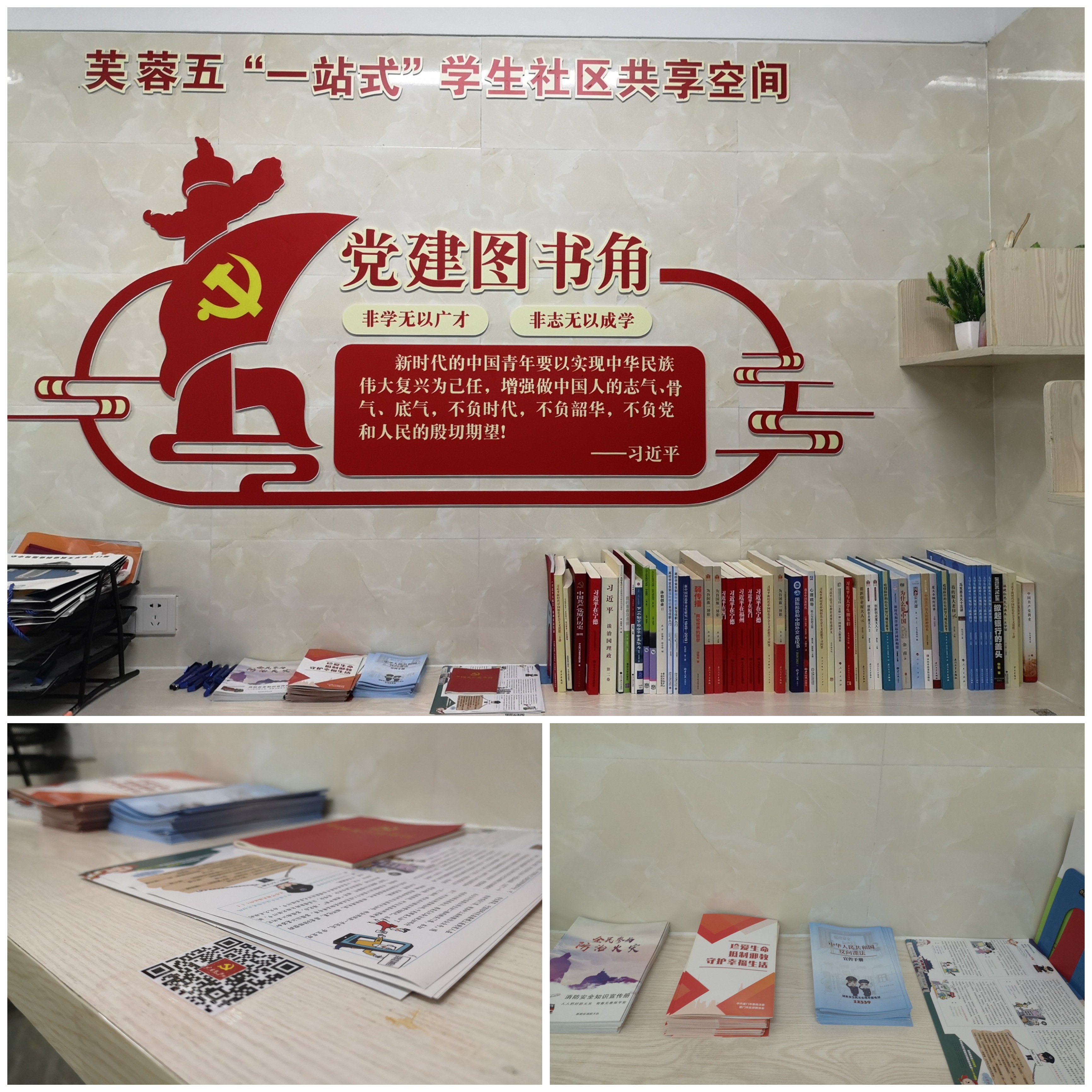 在全党开展党史学习教育的大背景下,为在学生社区贯彻“学史明理、学史增信、学史崇德、学史力行”的总要求,紧紧围绕“学党史、悟思想、办实事、开新局”的总目标,芙蓉五“一站式”社区兼职辅导员组织建设芙蓉五“一站式”学生社区共享空间及党建图书角。通过向学生处、保卫处及马克思主义学院募捐有关党史学习教育、校史学习、就业指导、心理健康、学校报刊等内容的图书报刊,方便芙蓉五的同学们利用课余时间进行党史学习教育、校史学习,让同学们在党史学习教育中感悟马克思主义的真理力量和实践力量,让同学们常学常新悟初心,学深学透担使命。