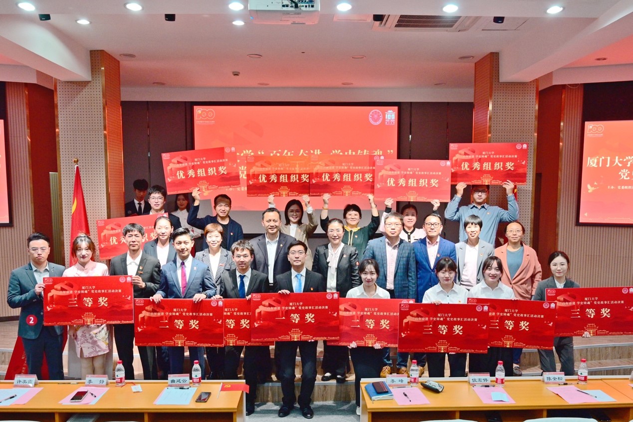 经过现场专家评委评审,化学化工学院荣获一等奖,法学院、海洋与地球学院、管理学院荣获二等奖,国际学院、生命科学学院、人文学院、电子科学与技术学院、经济学院/王亚南经济研究院、国际关系学院/南洋研究院荣获三等奖。人文学院、外文学院、法学院、化学化工学院、药学院、国际学院获得本次活动优秀组织奖。在场领导、嘉宾为获奖学院代表、选手颁奖,并合影留念。至此,厦门大学“百年奋进 学史铸魂”党史故事汇活动决赛圆满结束。