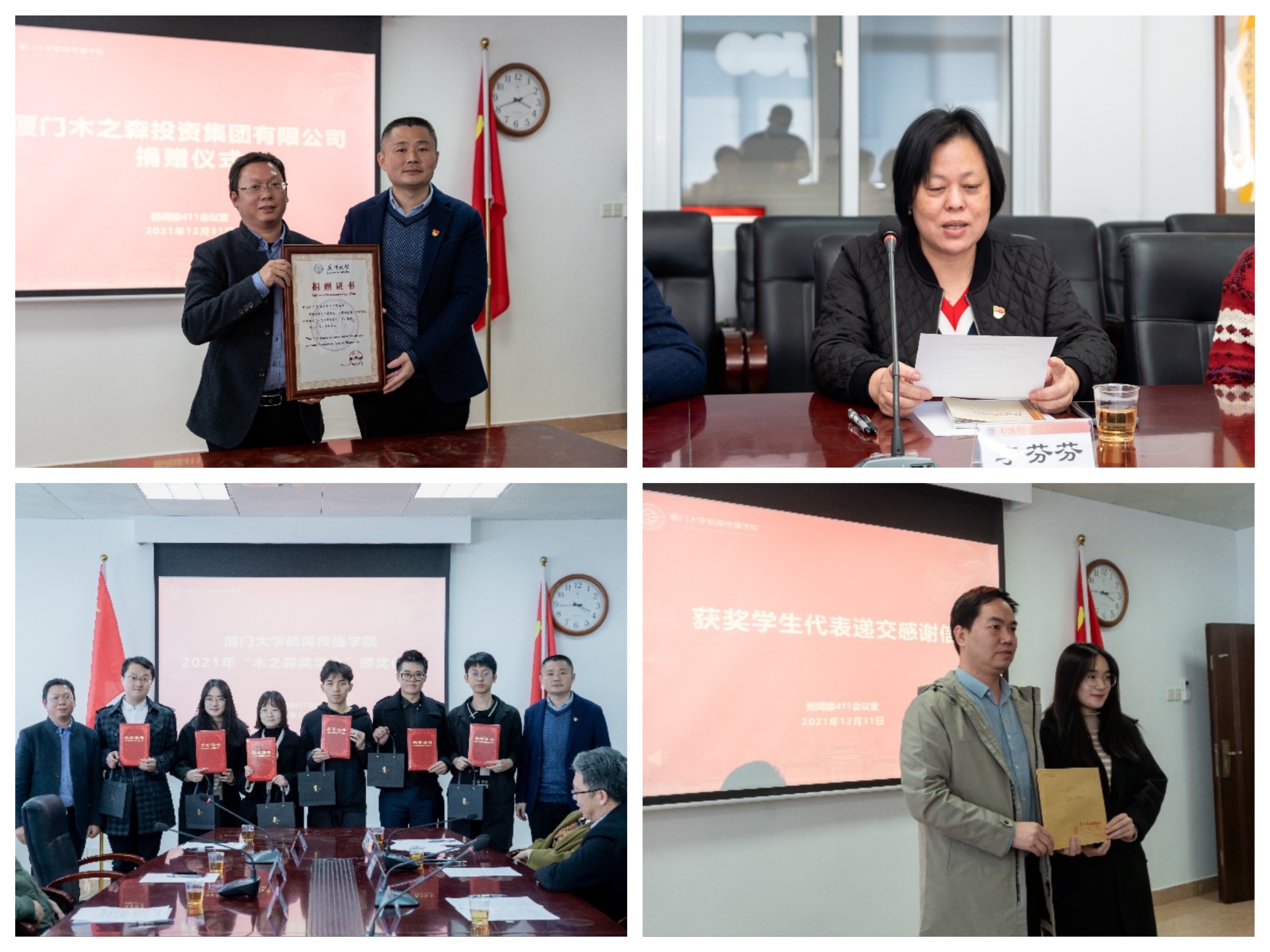 2021年12月31日下午,新闻传播学院2021年“木之森奖学金”颁奖仪式在新闻楼411会议室举行。厦门木之森集团有限公司董事长廖木森、党支部书记林贤明、执行董事纪华刚,新闻传播学院党委书记曾铮、党委副书记李芬芬、团委副书记、辅导员以及获奖学生出席仪式。新闻传播学院党委副书记黄辉主持仪式。
