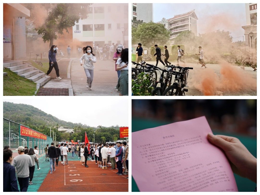 本次演练设在思明校区海韵11-15号宿舍楼及翔安校区南安园区12栋宿舍楼,共有来自30多个学院约3400名学生参加,涉及学院多、楼栋密,但在各单位的配合密切下,同学们反应迅速、应急演练成效显著。