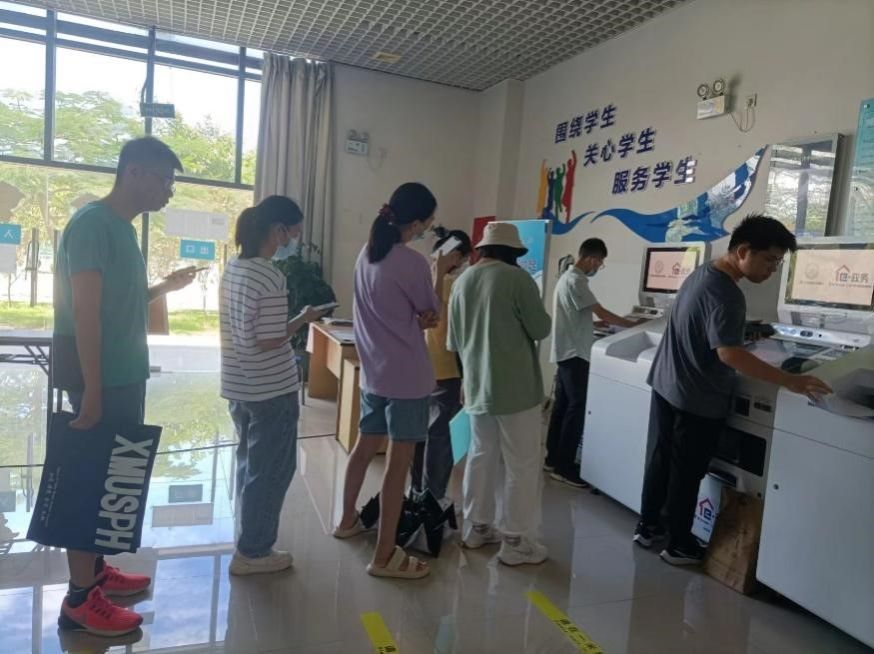 今年毕业季,教务处配备学籍服务学生队伍,创新学籍服务新模式,在思明校区学生事务大厅试行小程序预约取号、现场叫号的新模式,在工作人员的引导下,现场秩序井然。学生手机小程序扫码预约打印时间,现场工作人员根据现场打印进度情况进行小程序叫号。在试运行期间,工作人员即时根据现场打印等候人数调整和优化排队方式,并随时调试和维护自助打印机,保证打印机设备正常运行。