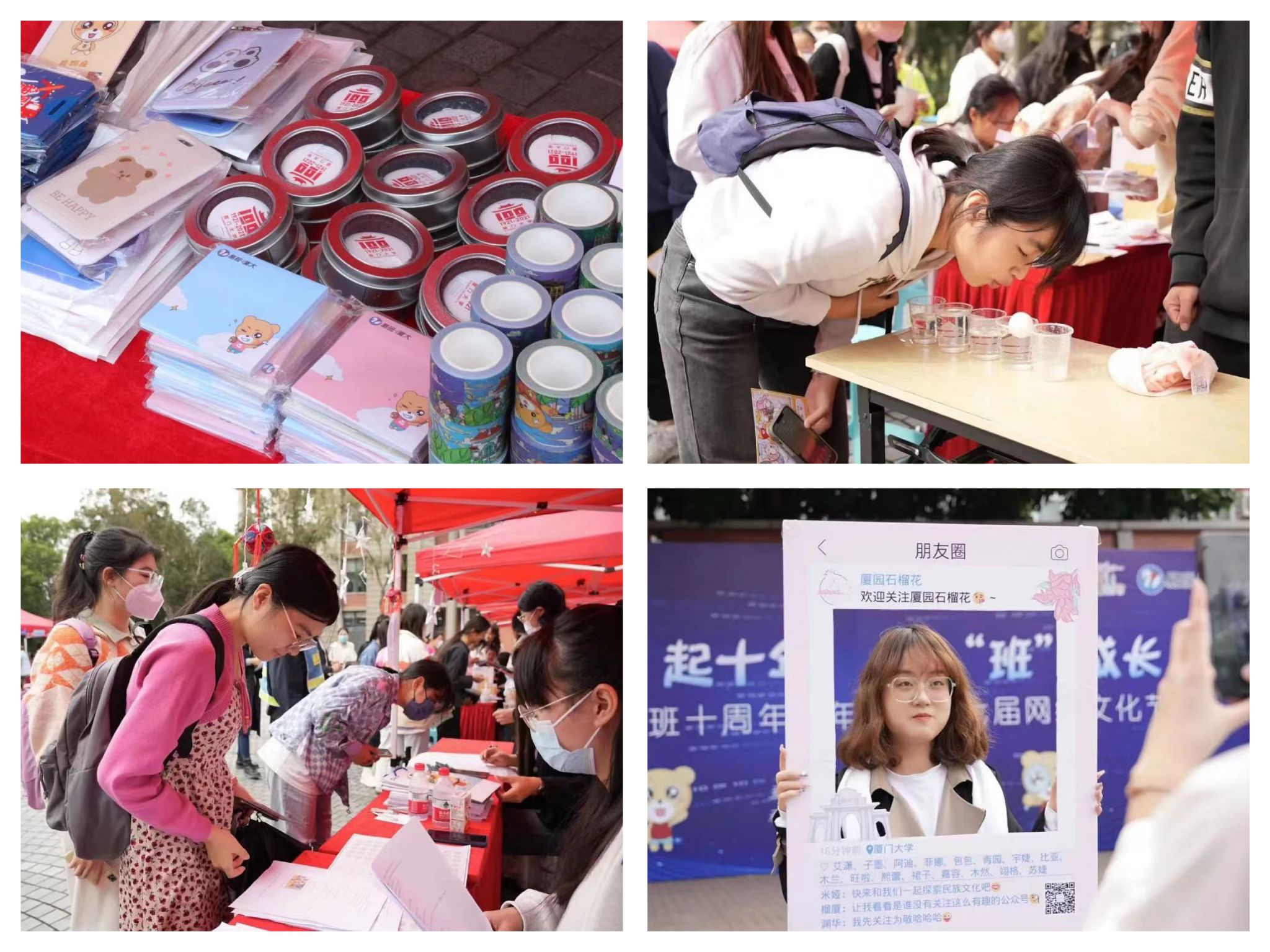 长期以来,学校坚持学生主体地位,将网络文化工作室作为网络文化建设的战略性、基础性工程来抓。学生工作处充分发挥校级易班工作站的“孵化器”作用,依托大学生创新创业训练计划,累计培育建设了577个网络文化工作室,涵盖技术研发类、主题创作类、社会服务类等多种类别。在今年的易班嘉年华活动中,“厦园石榴花”“厦大石语”“小动物在厦大”“易来益往”“易起走过的十年”“易起来过节”“风吹易厦”等7个网络文化工作室来到现场摆摊设点。各工作室结合自身特色和定位,精心准备互动项目和游戏,充分展示了工作室的优秀成果和团队风采。活动开始前,由工作室自行设计制作的、印有厦大或工作室元素的马克杯、U盘、帆布袋、鼠标垫、台灯等文创礼品很快吸引了往来师生的驻足关注。活动开始后,近千名师生踊跃参与互动项目和闯关游戏,在学习网络文化知识、欣赏网络文化作品中,很快将奖品赢取一空。