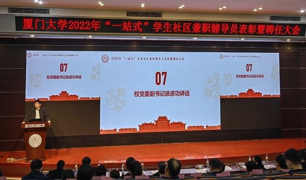 为深入贯彻习近平总书记关于教育的重要论述,落实立德树人根本任务,进一步发挥“一站式”学生社区重要育人阵地作用,推动机关干部、院系领导、专业教师、工程实验技术人员深入学生社区一线,3月3日下午,厦门大学2022年“一站式”学生社区兼职辅导员表彰暨聘任大会在经济学院N402报告厅召开。大会表彰了22名2022年“一站式”学生社区优秀兼职辅导员,选聘了143名2023年“一站式”学生社区兼职辅导员。校党委副书记徐进功出席会议。