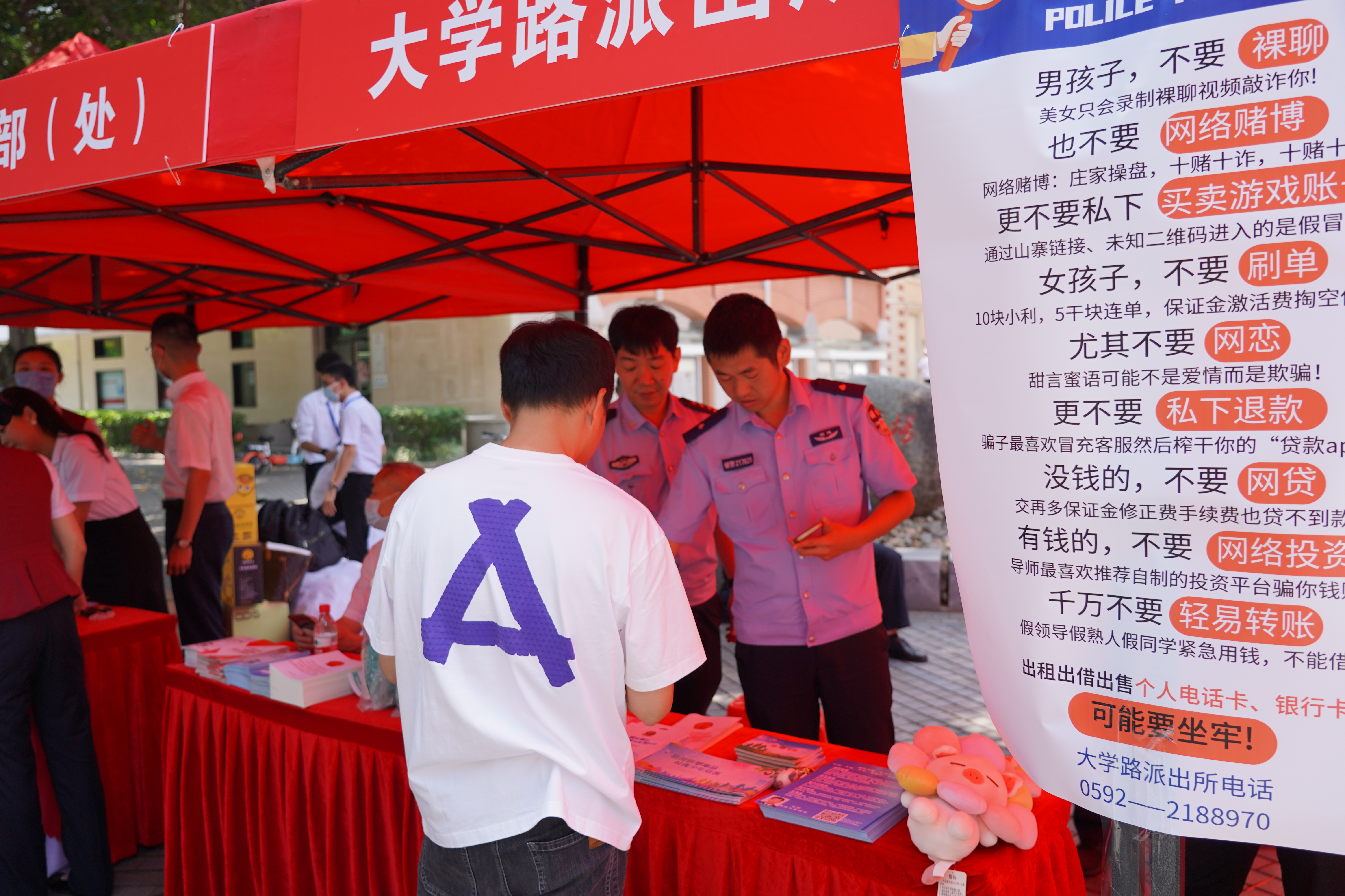 派出所联合校保卫部门,组织民警和保卫人员到现场与同学们互动,结合学生高发的网贷、刷单、交友、游戏充值等案例,通过以案释法和现场互动的形式,深入浅出地开展反诈宣传。兴业银行的工作人员现场为同学们普及征信、防范金融诈骗等方面的知识,提醒同学们增强金融安全防范意识。