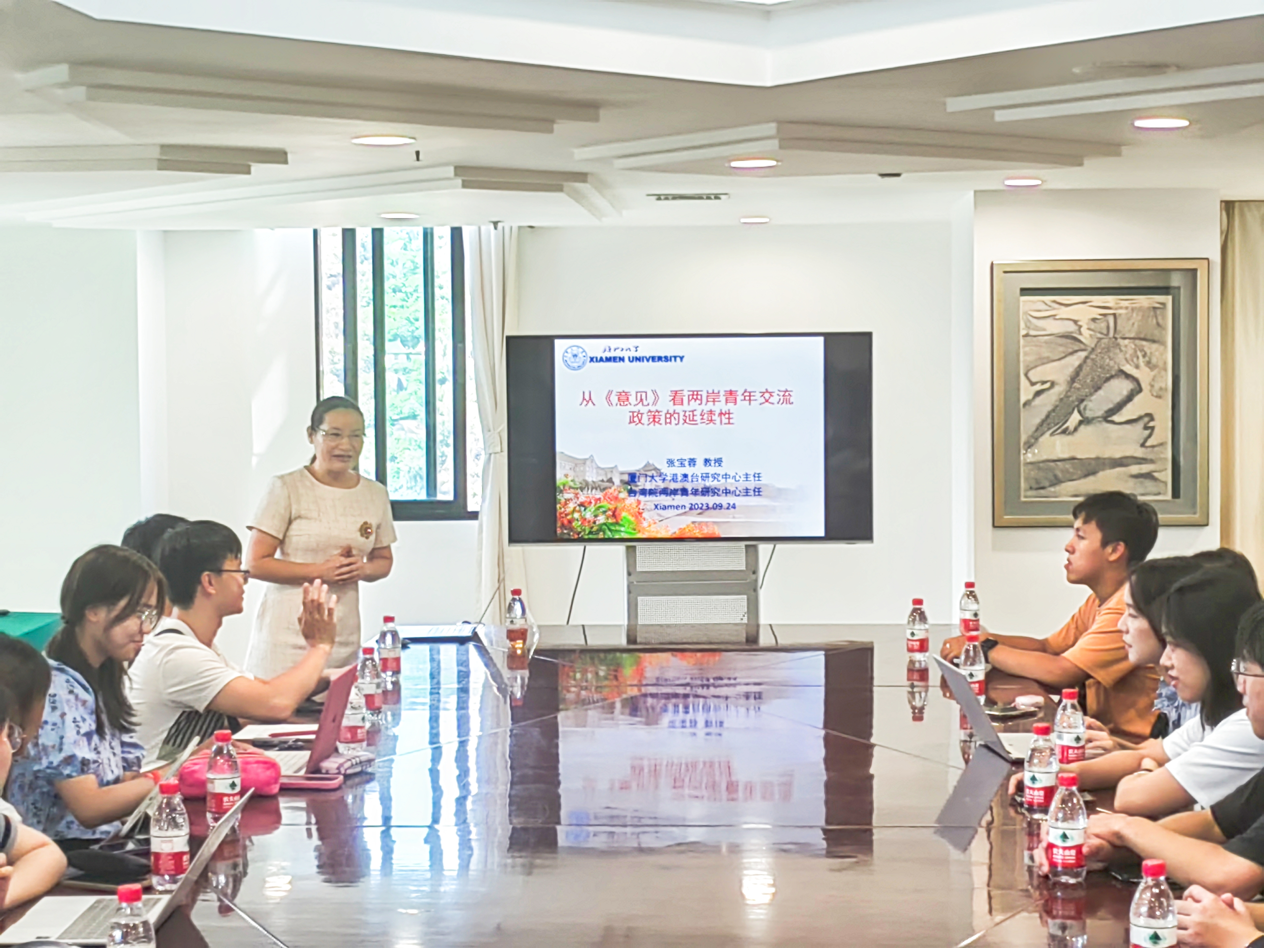 张宝蓉教授以《从<意见>看两岸青年交流政策的延续性》为题,与同学们进行分享和交流。她指出,《意见》目标明确,内容丰富,措施有力,体现出全域融合、在地融合、示范融合、创新融合、强化落地的“五大亮点”;《意见》同时指明了福建省建设海峡两岸融合发展示范区的三大融合发展方向:一是登陆台胞台企的在地融合,二是与台湾各行业领域的创新融合,三是厦门与金门、福州与马祖的示范融合。张宝蓉教授特别指出,《意见》全文中两次提到厦门大学的关键作用,充分展现了我校在海峡两岸融合发展过程中责任光荣且重大。