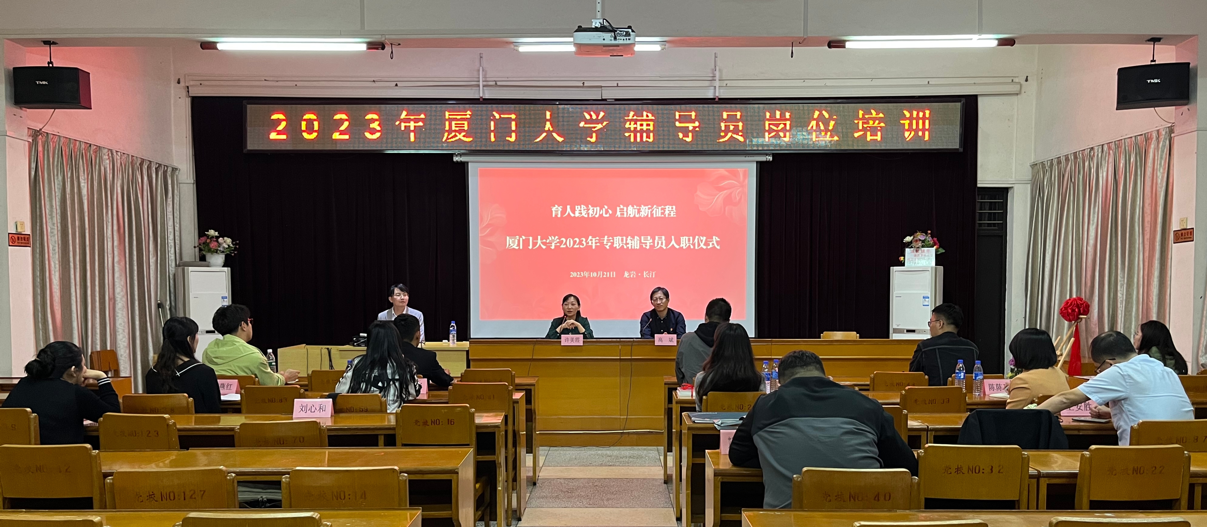 10月21日晚,厦门大学2023年专职辅导员入职仪式在长汀县委党校举行,仪式由厦门大学民族学生事务办公室主任王骥洲主持。仪式上,老辅导员代表、社会与人类学院团委书记王安胜通过分享“格局、担当、融入”三个关键词勉励新入职辅导员要加强理论学习,主动担当作为,围绕学生、关照学生、服务学生,培养有理想、敢担当、能吃苦、肯奋斗的新时代好青年。新入职辅导员代表、医学院辅导员陈陈瑾作分享了自己选择辅导员职业的初心,并代表参加培训的辅导员郑重承诺,将转变角色,认真学习,扎实工作,将个人工作主动融入学校发展大局,为党育人,为国育才。