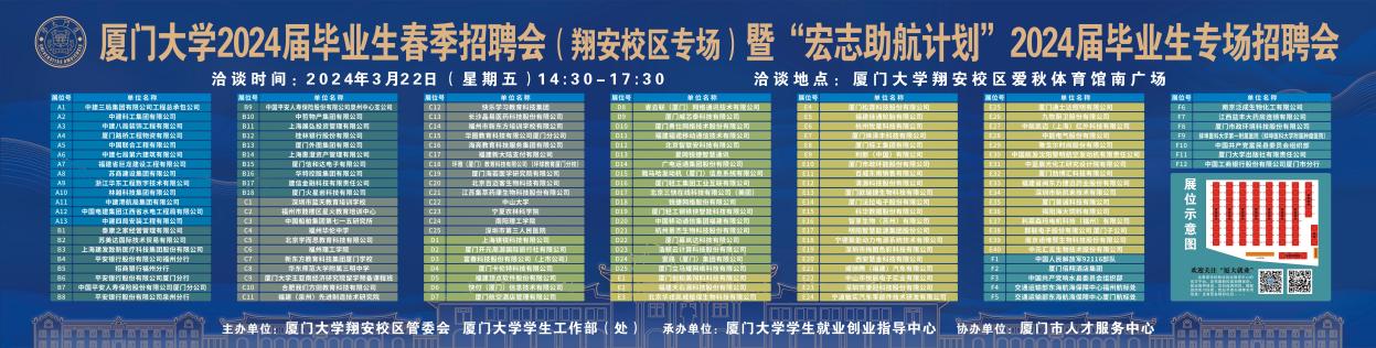 2024年3月22日下午,厦门大学2024届毕业生春季招聘会(翔安校区专场)暨“宏志助航计划”2024届毕业生专场招聘会于翔安校区爱秋体育馆南广场顺利举办。本次招聘会由厦门大学翔安校区管委会、厦门大学学生工作部(处)主办,厦门大学学生就业创业指导中心承办,厦门市人才服务中心协办。