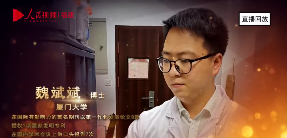 典礼上介绍了我院魏斌斌博士勇攀科研高峰的优秀事迹:魏斌斌在硕士研究生第一年即以第一作者身份在国际知名期刊《Journal of Materials Chemistry A》上发表论文,并获得硕博连读资格;在学期间,共署名发表SCI论文24篇,授权国家专利一项,参与多项校企合作项目,并在多场学术会议上作口头报告;担任多年博士班级党支部书记与班长,荣获国家奖学金、“厦门大学优秀共产党员”、“厦门大学优秀学生干部”、“厦门大学三好学生”、“厦门大学优秀毕业生”等多个奖项与荣誉称号。