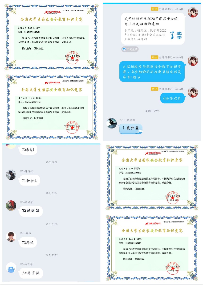 2017级本科生四班团支部书记肖金龙说:“安全时时强调,安全事故却时有发生。大到国家安全,小到个人安全,必须引起每个青年团员的重视。积极认真学习掌握安全知识,坚决维护国家安全是每个人的责任与义务。维护国家安全与每个人的切身利益密切相关,国家安全的实现有赖于人人参与,人人有可为。作为团支部书记,我更要以身作则,积极做好带头作用,向团员宣传安全知识,增强团员青年的安全意识,为国家各方面的建设献出自己的力量。维护国家安全,人人都是主角,让我们共同守护中国!”