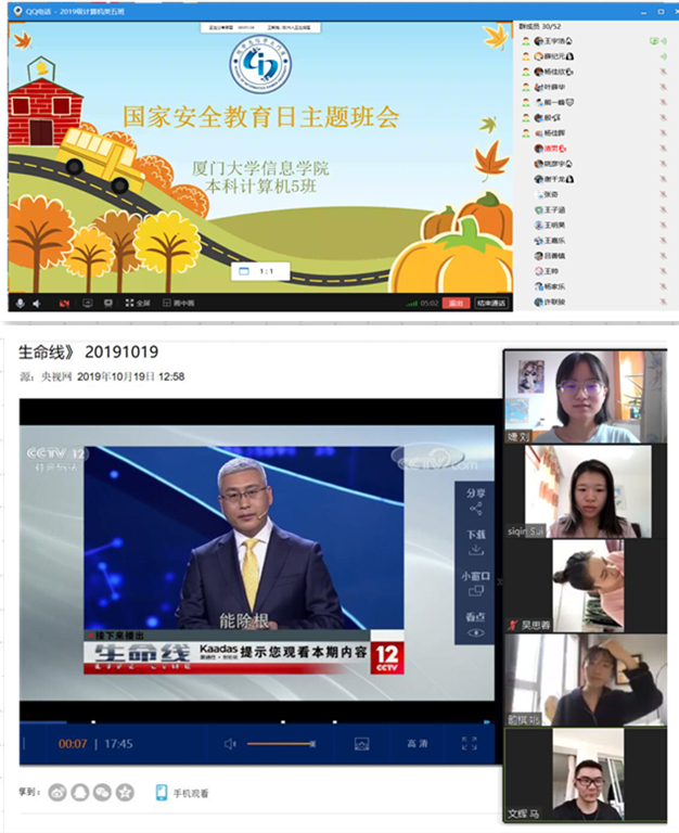学校以党团支部为依托,党员带头,党团班联动,通过开展形式多样、内容丰富的主题党日活动、团日活动、在线“云”班会等,增强师生学习的积极性,强化师生的情感认同。国际关系学院/南洋研究院行政教工党支部将国家安全教育和固定党日活动相结合,组织开展支部线上学习。生命科学学院本科生第一党支部举办国家安全教育日“云党课”活动,由支部书记江子扬进行主题为“坚持总体国家安全观”的党课活动。公共事务学院团委指导各学生团支部举办以“新时代的国家安全”、“ 没有硝烟的战争——保护国家安全是头等大事”等为主题的“云团课”活动,由团支部书记江佳颖、童弋馨等结合当下国内外新形势,与支部同学分享对国家安全的理解与认识。辅导员陈国渊以总体国家安全观为统领,召开主题“云班会”,为学生全面阐述了国家安全教育日来源和背景。此外,厦门大学还通过学生安全员队伍,带领发动全体学生观看央视“社会与法”频道播出的国家安全教育日特别节目,学习国家安全举报及自首典型案例。通过学习,生命科学学院2016级本科生党员赖章健分享,“一个国家的安全,大到与民族息息相关的国土安全,小到与个人有关的网络安全,每一个人都可以为国家安全做出贡献。可能戍边卫国对我们来讲有些遥远,但作为生科人,我们可以在生物安全方面做出自己应有的贡献。”