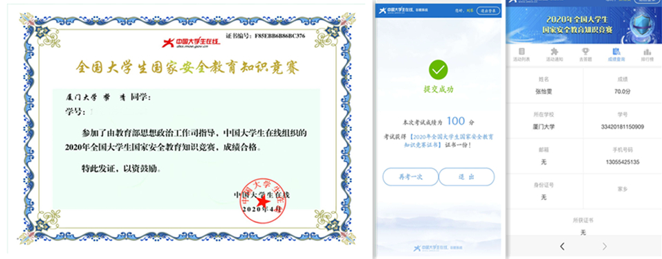 学校依托中国大学生在线平台,组织学生参加“2020年国家安全教育知识竞赛”,以网络答题方式普及国家安全教育知识。竞赛内容涵盖总体国家安全观、国家安全制度体系、国家安全法治、国家安全战略、国家安全教育等内容,每次答题,系统将随机从题库中抽取10道题,学生完成答题且得满分后,平台将发放竞赛证书。活动累计吸引到上万名学生参加,在全校掀起了国家安全教育知识的学习热潮。为做到学思行贯通,学校还聚焦网络安全领域,举办厦门大学第四期“网络素养训练营”和第二届寻访“校园好网民”活动,不断增强学生网络安全防御能力,提升学生网络素养和网络安全意识。