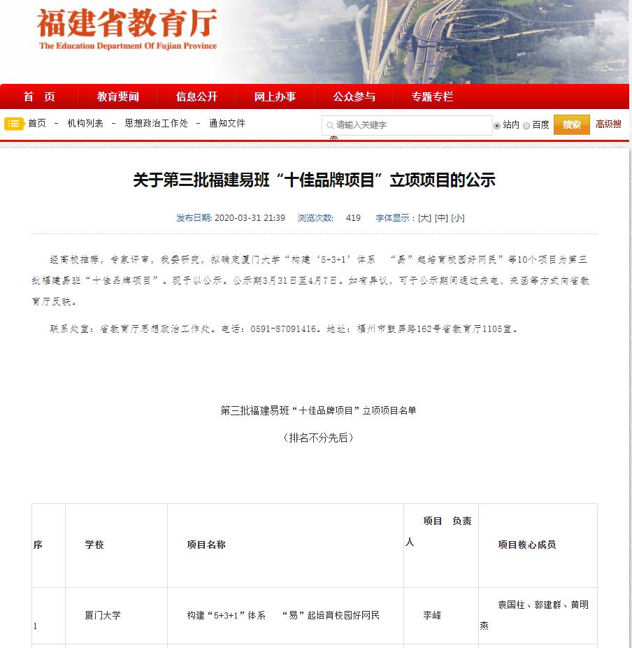 近日,福建省委教育工委公示第三批福建易班“十佳品牌项目”立项项目,我校申报的网络文化工作项目《构建“5+3+1”体系,“易”起培育校园好网民》获得立项。这是继2017年《百花齐放共建易班行动》、2018年《基于易班的i校园学工平台建设》两个项目后,我校连续第三年获得该活动立项。