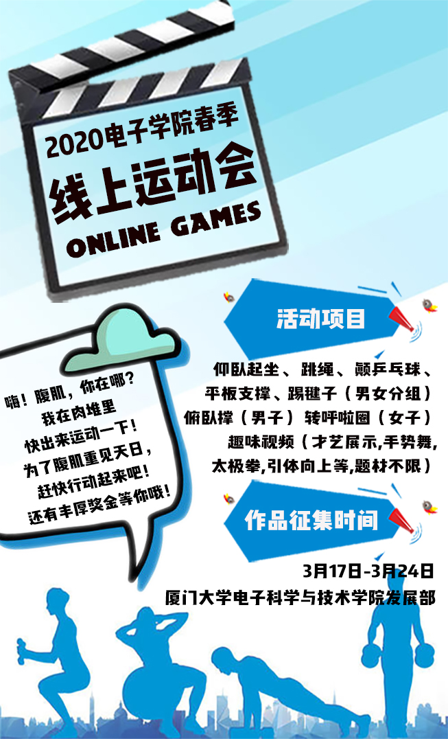 受新冠肺炎疫情影响,学生日常的体育运动节奏被无情打断。为响应学校疫情防控工作要求,近日,厦门大学电子科学与技术学院举办了第一届线上运动会,赛期持续2周,覆盖全院1309名学生,最终产生36名“运动达人”。本次线上运动会集群众性、专业性、趣味性于一体,打破了户外体育竞赛的固有模式,解锁了居家体育运动的“新姿势”,学生参与多、锻炼效果好。