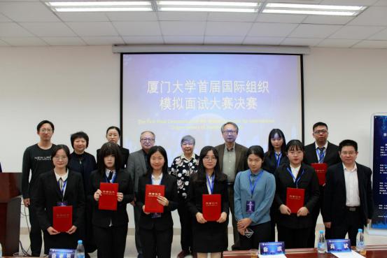 11月30日上午,厦门大学首届国际组织模拟面试大赛决赛如期开赛。徐亚男大使、李正仁教授、傅鹏辉教授应邀出席并担任评委,校学生处副处长高斌,外文学院党委副书记杨云良、副院长徐琪出席本次活动并为获奖选手颁奖。