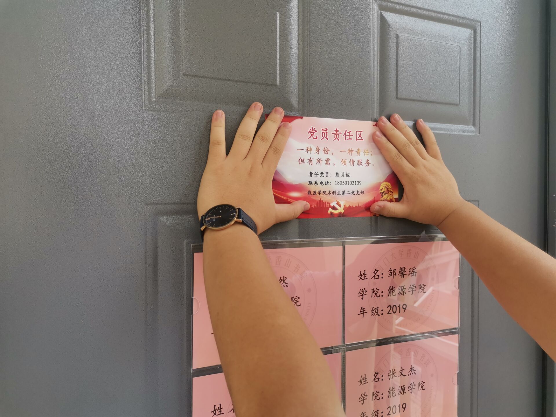 一位党员一面旗,能源学院学生党员争先锋做表率,在迎新中发挥“传带帮”的重要角色。以宿舍为阵地建立党员责任区,在每间新生宿舍的门上都贴有一位对应责任党员的联系方式,“有困难找党员”,新生们在学习或生活上遇到各类问题都可以第一时间向党员请教;同时作为学院迎新传统之一,由学生党员及学生干部亲手为每一位新生准备了手写信,将他们的大学体会以信为载体传送给新生,充分发挥党员先锋模范的带头作用。
