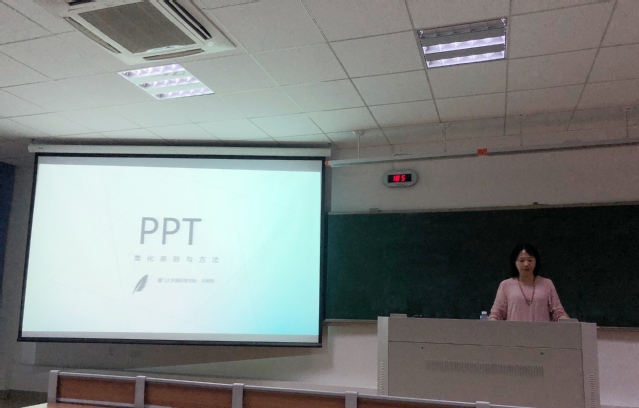 图书馆馆员向琳艳从PPT的四大美化原则入手,通过大量操作简单、方便实用的“干货”,介绍了PPT制作过程中提高效率、快速美化的制作技巧,同时还给在场的学生助理们带来了免费高清大图、免费PPT模板等重磅福利,为学生铺就一条从“菜鸟”到“高手”的进阶之路。
