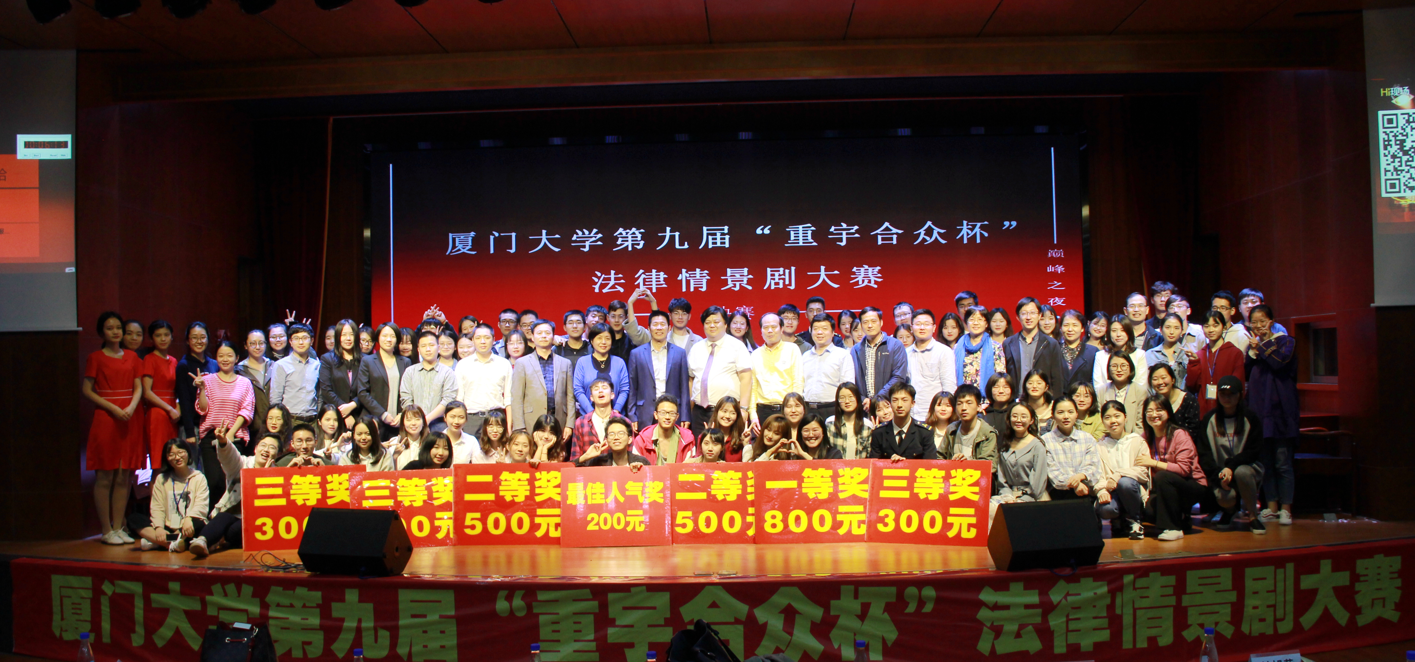 厦门大学法律情景剧大赛自2009年创办以来,已成功举办九届,是提升学生法学专业素养、展现法学学子风采的一个“跨高校、跨专业”的品牌赛事。该赛事由同学们自导自演,以情景剧的形式使法律知识摆脱文本的限制,实现法律知识从课堂向校园和社会的延伸;它丰富了法学人才培养的常规模式,有利于提升学生实践能力,实现以“提高法律人才培养质量”为任务的卓越法律人才培养计划。大赛还邀请集美大学等兄弟院校共同参与,增进了高校之间的友好沟通,提供了更加广阔的交流平台,促进应用型、复合型法律职业人才的培养。