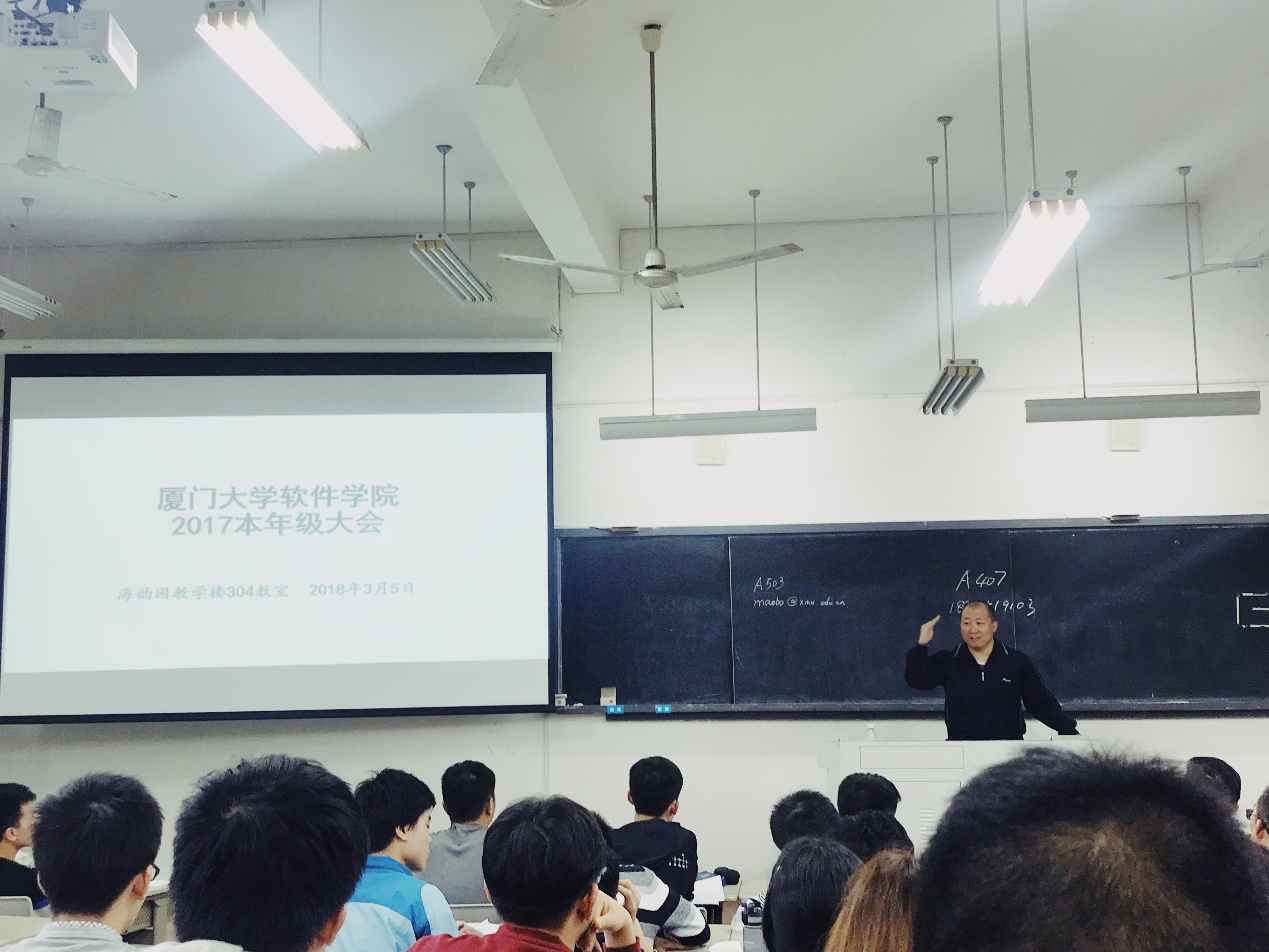 3月5日下午七八节课,软件学院2017级本科生年级大会在海韵教学楼304教室召开,班主任程轩、毛波和辅导员李绍玉三位老师共同为同学们分析大一上学期的期考试成绩,并为大家如何过好大学生活提出忠告和建议。