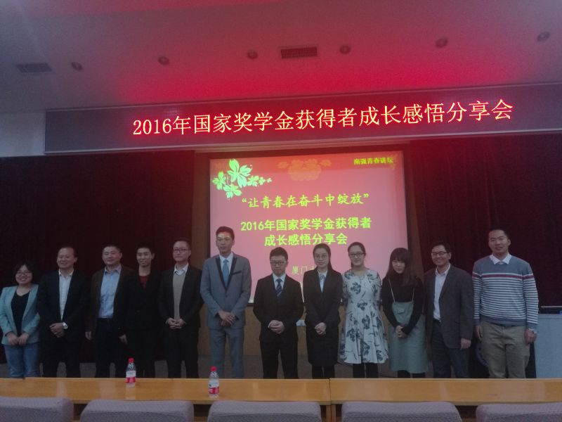 为深入挖掘厦门大学学生当中涌现的先进个人、凝聚青春智慧,鼓励先进模范、树立大学生身边的榜样、更好地引导青年学生成长成才。12月23日晚,2016年国家奖学金获得者成长感悟分享会在厦门大学化学报告厅举行。6位国家奖学金获得者结合各自的成长经历、学习经验、实践创新和人生感悟,用自己的不凡经历讲述着自己不平凡的生活态度和人生追求,充分展示了当代优秀大学生的形象。