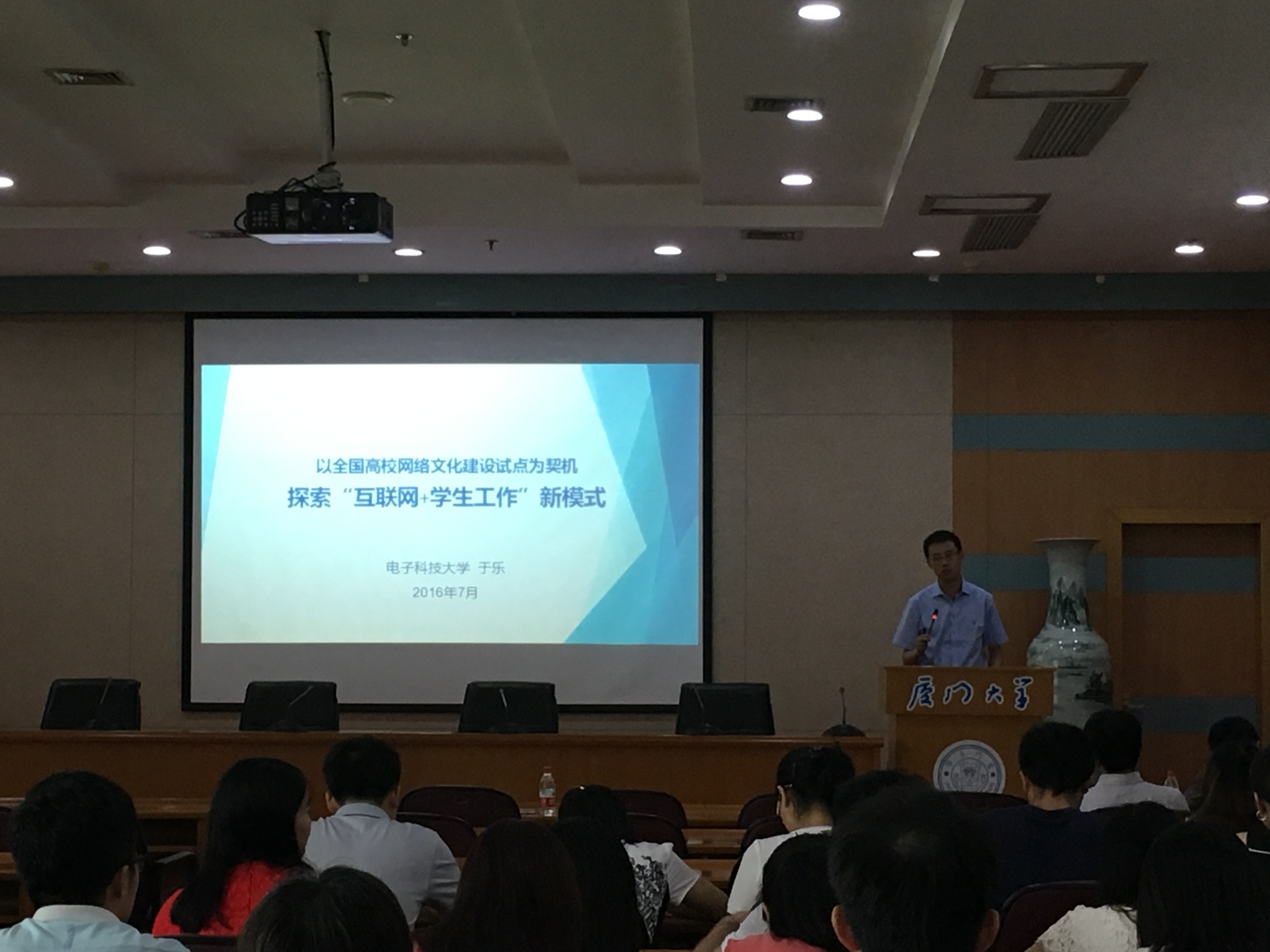于乐老师从互联网技术的发展进程谈起,提出网络已成为当代大学生重要的生活环境。作为辅导员应努力追逐网络热点,和同学在一个频道上对话和交流。作为教育部第一批网络文化专项试点单位,电子科技大学在校园网络文化建设方面积累了一些建设经验。在本次报告中,于乐老师向大家详细介绍了电子科技大学是如何从“创新工作机制,激发网络思想政治教育工作新动力”,“推进平台建设,构筑网络思政政治教育新阵地”和“加强队伍建设,掌握网络思政政治教育主导权”三个方面,实现校园网络文件建设四个“一”的目标,即构建一个网络宣传和思想教育的大平台、培养和打造一支专兼职网络育人精英团队、探索建立一套网络育人的管理机制和工作机制以及培养一批成熟理性自律的大学生网民。