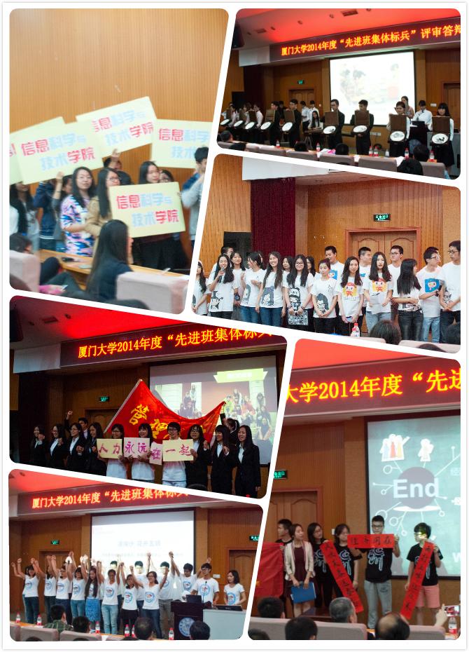 同一片天空,不一样的精彩。4月24日晚,厦门大学2014年度先进班集体标兵评选活动在化学报告厅举行。学生工作部部长夏侯建兵,校党委组织员姚有新,学生工作部副部长宋友良,学生工作部副部长、翔安校区学生办主任张清榕,研究生院综合办公室副主任罗春霞,校团委副书记廖晓波,以及各学院、研究院党委副书记出席评审会,并组成先进班集体标兵评审小组。经各学院、研究院推选,共有来自全校各单位的24个候选班集体参与评选。