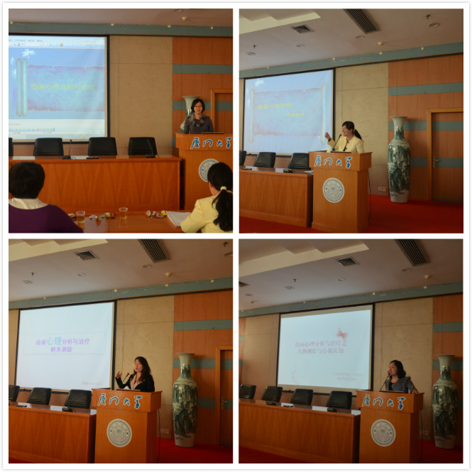 软件学院辅导员葛学凤、艺术学院辅导员王亚群、艺术学院辅导员张秀丽及生命科学学院辅导员吴佳蓓分享的主题是“绘画治疗与学生工作”。葛学凤首先从整体上介绍了“绘画治疗”的基本内涵,并邀请在场所有辅导员共同参与,共同作画,引起了大家极大的兴趣。接着,其余三位主讲人分别就“绘画心理分析”中 “房屋、树木、人物”的不同涵义进行了详细介绍,同时结合具体案例做了阐释,带领在座辅导员们充分体会了绘画治疗“此处无声胜有声,述说不清能看清”的妙处。