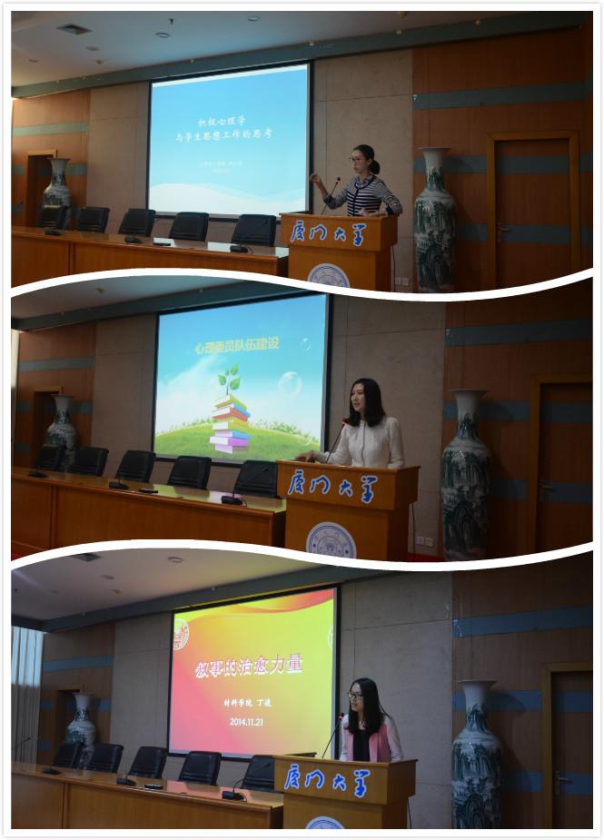 在“积极心理学视角下的心理委员工作”的主题分享中,化学化工学院辅导员陈沁芳简要介绍了积极心理学的相关背景和概念,并就自己在学生思想工作中的思考和大家做了交流,强调在积极心理学视角下,要关注学生的“性格优势”和“美德”,单纯地关注个体身上的弱点和缺陷不能产生有效的预防效果。公共事务学院辅导员李思颖结合自身参与的工作,分别从培养理念、管理模式、培训体系及工作支持平台四个角度介绍了心理委员队伍建设工作。材料学院辅导员丁渡则就“叙事治疗法”适用的普遍性、具体应用方法、带来的启发等方面做了分享,同时结合案例,重点探讨了叙事治疗的具体应用,详细讲解了如何发挥叙事的治愈力量。