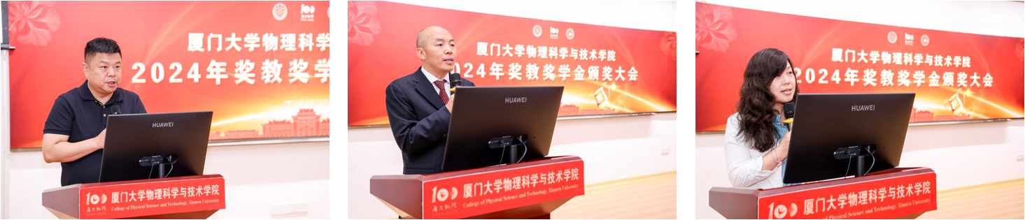 2020级本科生余星城、2021级硕士研究生陈柏逸、物理学系吴雅苹教授等三位获奖师生代表先后发表感言。他们对各位校友与社会各界人士的慷慨捐资表示由衷感谢。他们表示,奖教奖学金将激励学院师生继续投身于科学研究、社会服务等领域,厦大物理人会奋勇前进,为学校和学院的发展作出新的贡献。