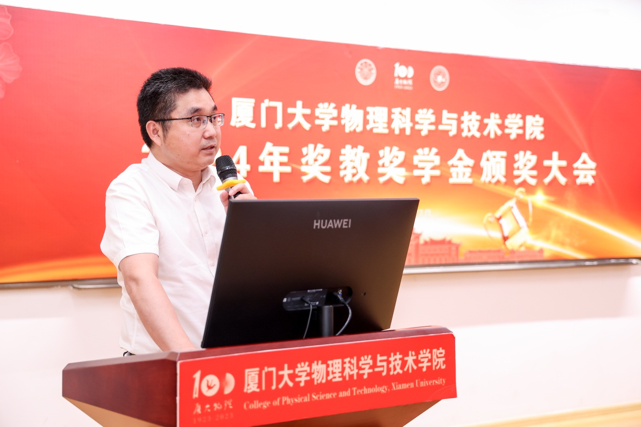 学院党委书记李书平在致辞中代表学院向校友及社会各界人士的慷慨捐赠表示感谢,对获奖师生表示祝贺。他回忆了厦大物理的百年发展历程,介绍了近年来厦大物理学科取得的各项成绩,展望了学科发展的新方向。他希望全院师生继续发扬“自强不息,止于至善”的精神,在学习科研、科创竞赛、社会服务等领域全面发展、再创佳绩。