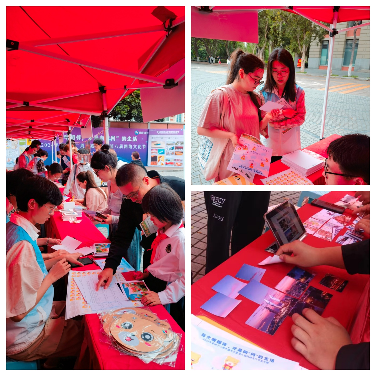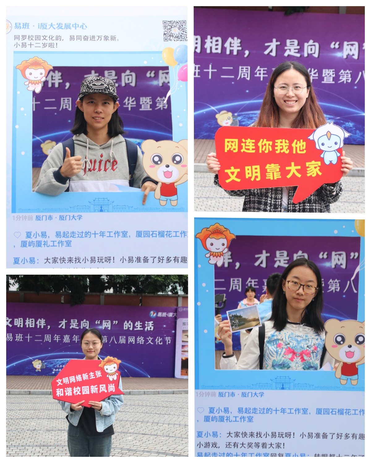 习近平总书记指出,“网络文明是新形势下社会文明的重要内容,是建设网络强国的重要领域”,强调“要坚持发展和治理相统一、网上和网下相融合,广泛汇聚向上向善力量”。本次活动延续传统,继续将全国大学生网络文化节厦门大学校内作品征集活动获奖作品与易班嘉年华互动游戏项目结合。在获奖作品展示区,一幅幅精美的网络文化作品,吸引力师生驻足观看;在游戏互动区,师生们在“厦大知识知多少”项目中了解校史校情,在“网络佳作配一配”游戏中欣赏优秀摄影作品,在“佳作对对碰”游戏中感受公益海报传达的理念;在留言拍照区,师生们写下对易班的祝福和对文明上网的承诺,与写有“文明上网”的手持板留下定格瞬间……活动当日,近千名师生热情参与互动项目和游戏环节,在寓教于乐中涵养网络文明风尚,提升网络文明素养。