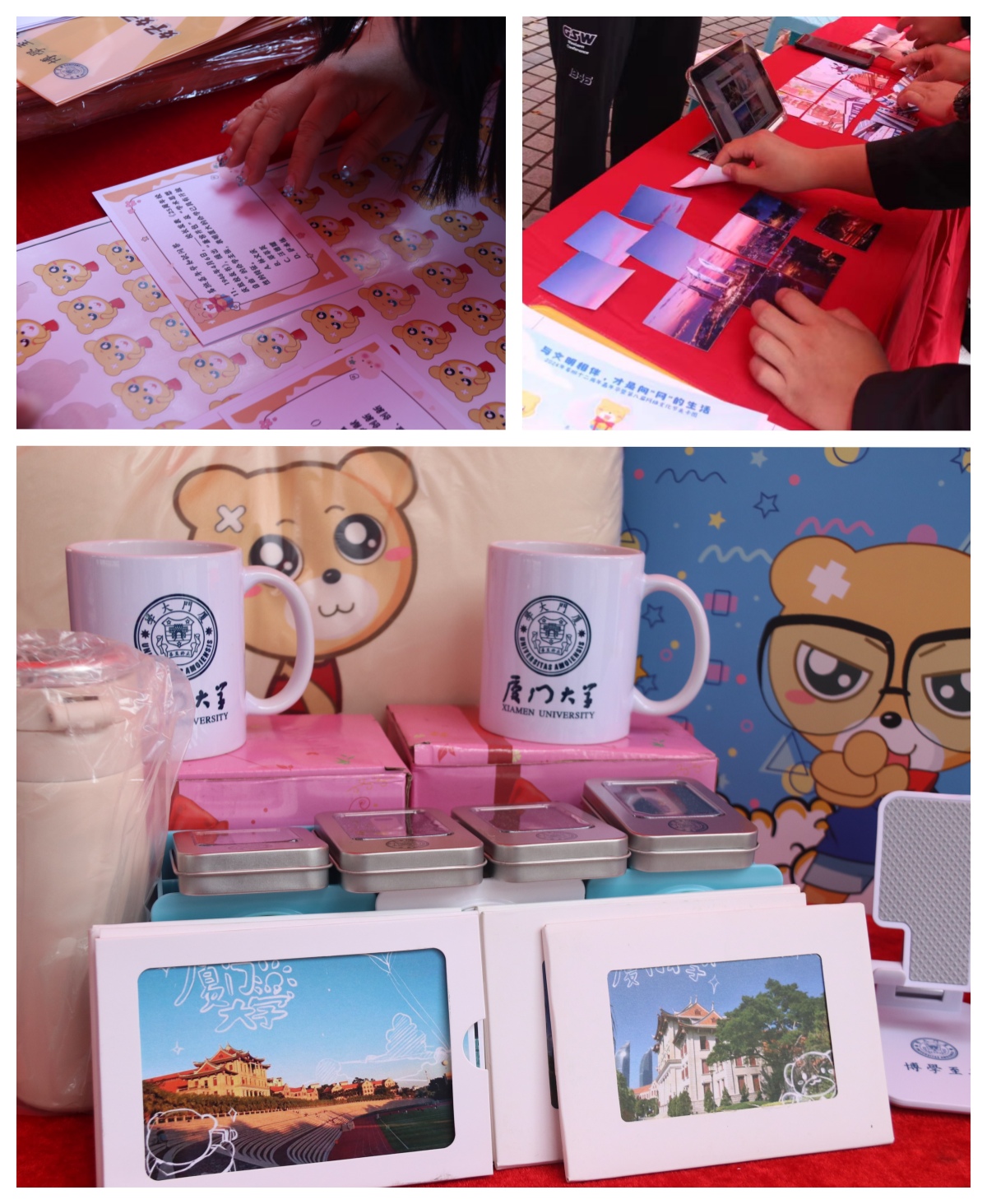 活动还邀请了“厦园石榴花”和“厦屿厦礼”等网络文化工作室到现场摆摊设点。工作室以精心设计的互动游戏和文创作品,充分展示了工作室的优秀成果和团队风采。印有厦大或工作室元素的马克杯、优盘、帆布袋、鼠标垫、台灯、卡套等精美文创礼品吸引了往来师生的广泛关注,深受大家的喜爱。